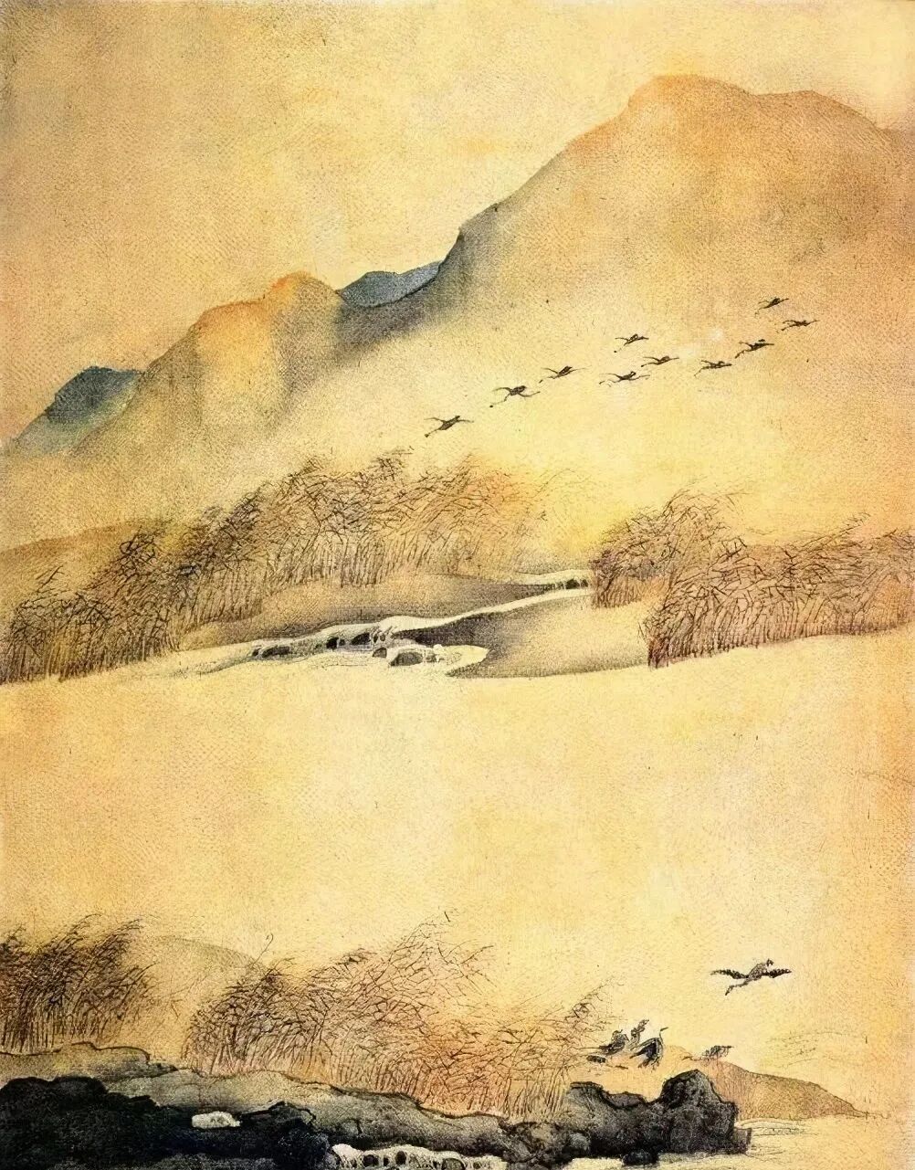 刘度,生卒年不详,明末清初画束、杭州人。擅画山水,为蓝瑛弟子。此册共有八开,该图为其中之《苇渚群雁图》,描写溪塘秋暮的景色。湖水如镜,浅渚处有三五大雁,形态生动,用干而淡的笔墨画芦苇,层次分明,远景为夕阳中的远山和雁群暮归的景色。全图施以淡赭 ,表现了清秋的气氛。