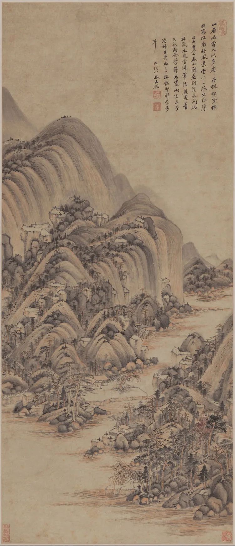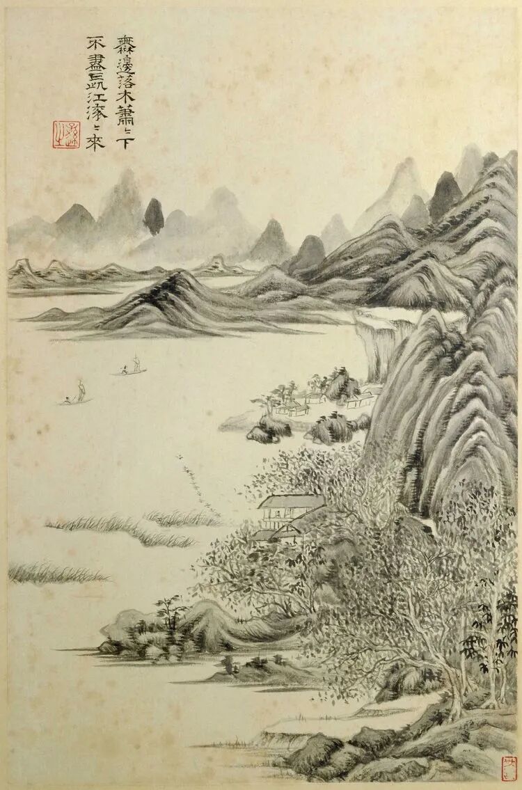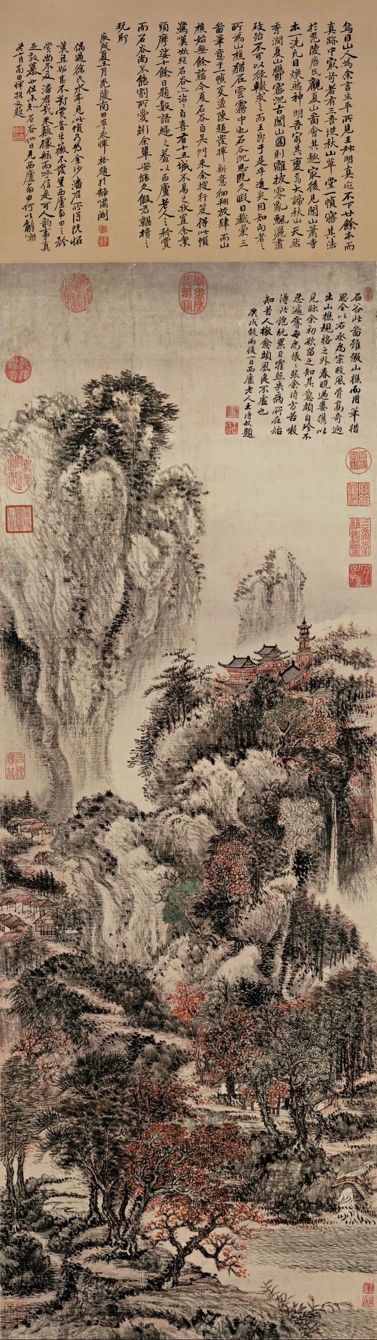 王鉴~富春山居图,自跋:山居幽赏入秋多,处处丹枫映黛螺。欲写江南好风景,霅川一派出维摩。子久(黄公望)有《富春山居图》,为荆溪吴问卿所藏,元气灵通,笔法遒美。董文敏向余击节不置。雨窗无事,漫师其意为之,殊愧邯郸学步耳。戊戌(1658年)小春王鉴。