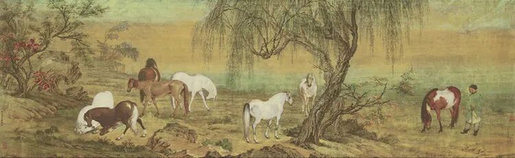 郞世宁~郊原牧马图,绢本,设色,51.20×166cm,故宫博物院藏。图绘一片草丰水清之地,八匹骏马嬉戏打闹,一匹棕色马略显瘦削,背部肋骨突出,基它马匹健壮肥硕;右侧着绿色大褂的马官,手牵缰强,专注的盯着骏马吃草。技法上,背景以二色模糊处理,近景以写实处理,下垂的柳条、多彩的树叶,清晰、细致。