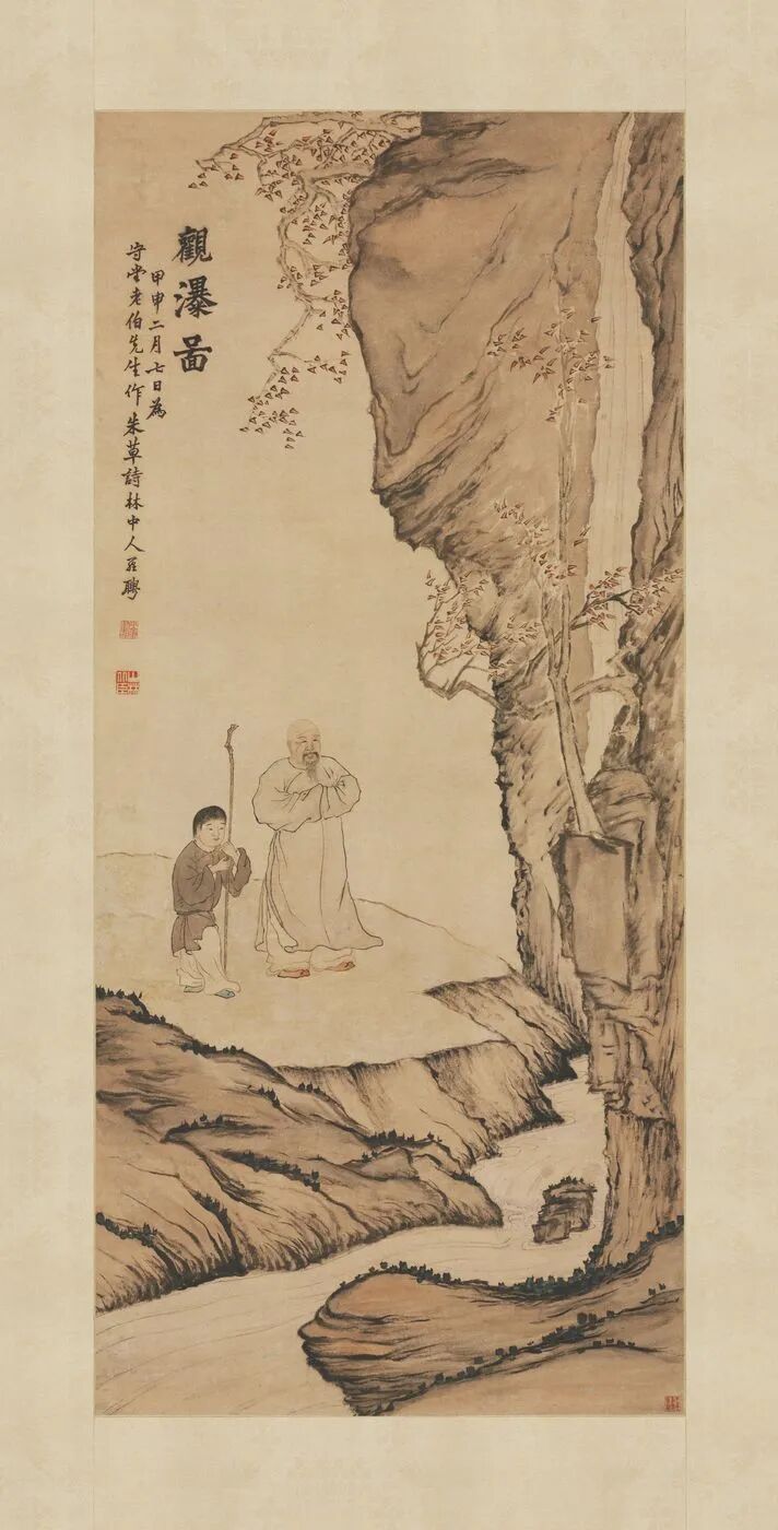 罗聘~观瀑图,此幅绘红树岩壁下一老者正在袖手观瀑,旁有小僮槜杖陪同。意简境深,罗遯夫乃金寿门高足,此作山石用笔深重,点苔浓密,而人物用笔清简,得山林之趣,画史称罗两峰于画科无所不能,信哉。