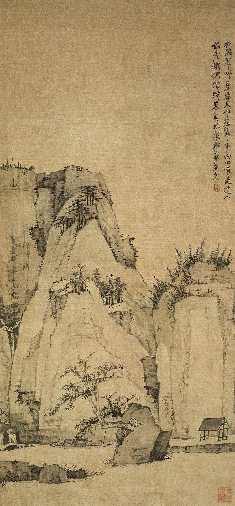 本幅自题:“春木抽柔条,秋老惊摇落。百年强近半,世味亦索莫。何如长林间,逍遥自解缚。荣枯听时序,动息任吾乐。写此林峦意,萧然远城郭。静致若可耽,慎哉勿耽搁。渐江。”钤“渐江”朱文印、“懒”白文印及引首印“怡情山水”。渐江此画以铁线勾勒为主,“借地为白”,略加渲染,山石大面积留白,为其画平添了几分冷逸。