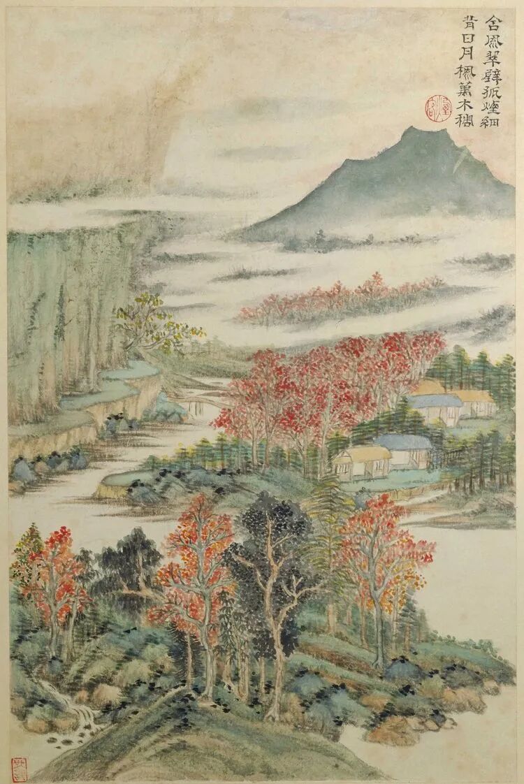 王翚~溪山红树,纸本,设色,112.4*39.5cm,台北故宫博物院藏。此图为王翚仿黄鹤山樵王蒙的一件极具特色的代表作,描绘了遍山红树的一片秋日山林景色。远处巨峰突兀高耸,摇摇欲坠之垫;数座楼阁掩映于山林之中;近处溪水流淌,两岸树木红叶飘飘,一派浓郁的秋色之景。