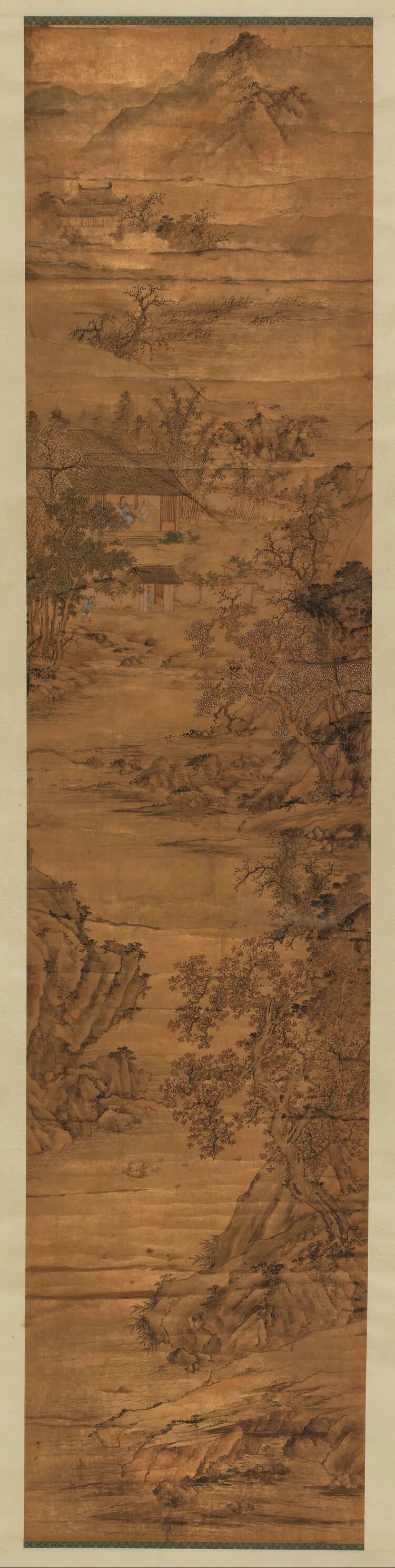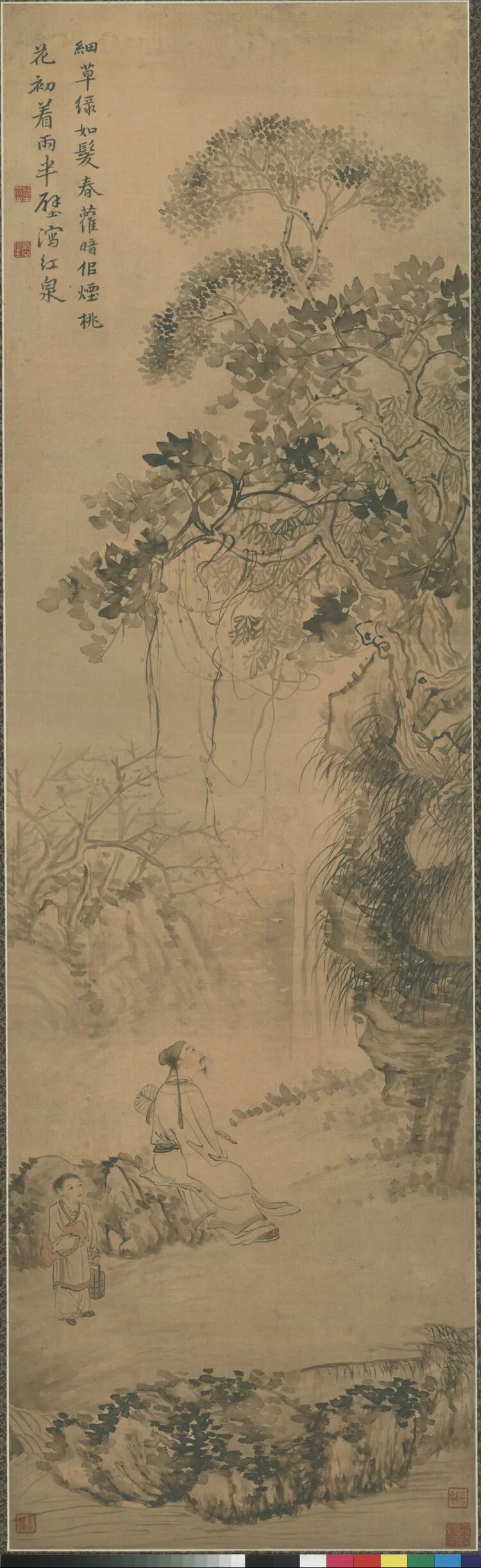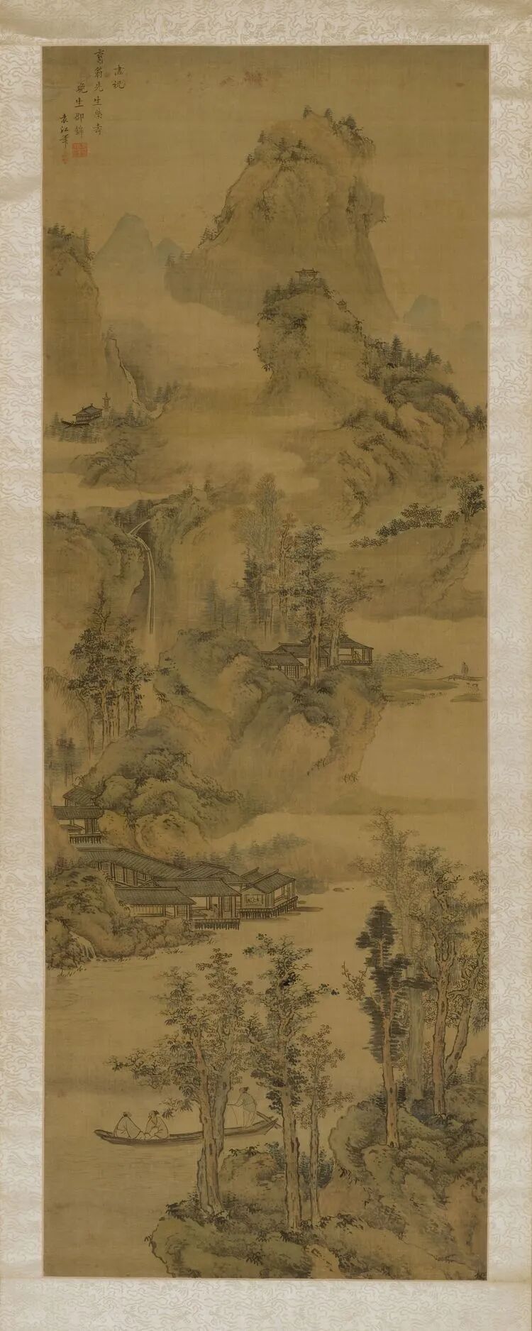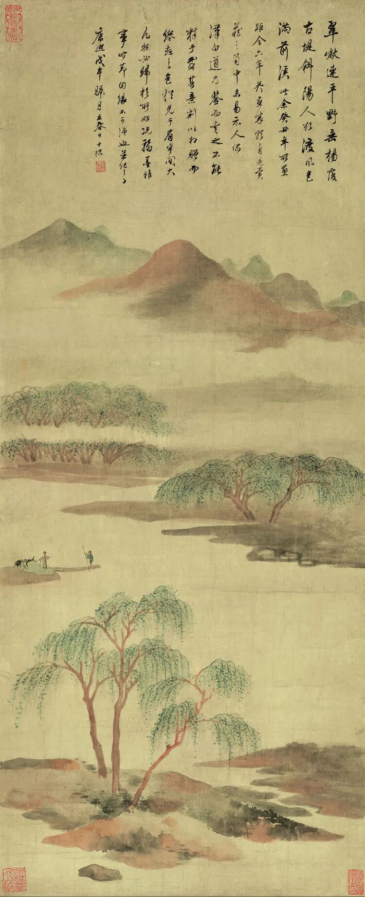 查士标,山水图,纸本,淡设色,90.1x36.7cm,辽宁博物馆藏。此图为查士标少见的淡设色绘图,远处云山相融,近处滩涂数座,柳树成荫,丝绦垂荡;二人一驴,点缀画面。查士标,字二瞻,号梅壑散人,清初画家,与孙逸、汪无端、僧弘仁等书画家一起被称为“新安四家”。