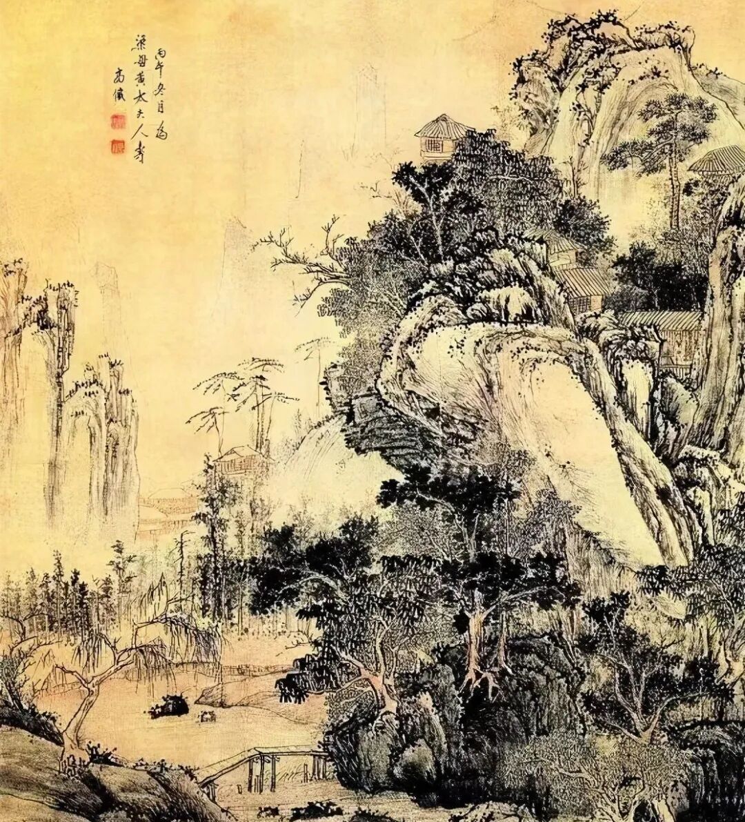 此图仿黄公望富春胜览图笔 意。笔触清快,用墨精致,墨 彩斑斓,构图虽取富春图,但 画面更多地采用深远法。