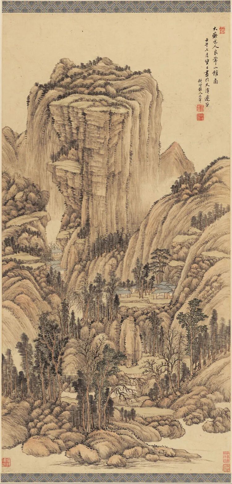 高俨(1616-1687),广东新会人。多才多艺,尤擅 山水,笔墨苍劲浑厚,晚年益精。此图是作者为朋友 之母祝寿之作。画中落笔沉着,墨色富有层次,画风 浑厚森秀,是高俨的代表作。