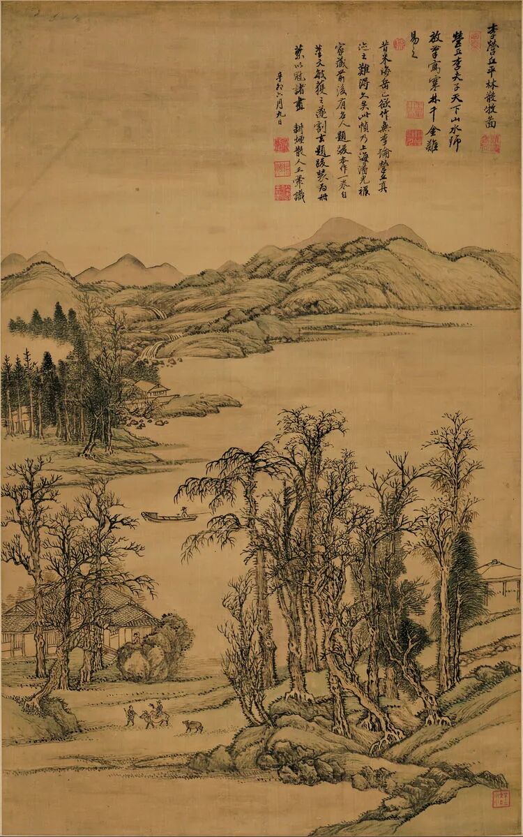 翚~平林散牧图,此幅自题仿李营丘平林散牧图。并言:“营丘李夫子,天下山水师,放笔写寒林,千金难易之。”可见其对李成的仰慕之情,本幅是其晚年所作,用笔稍纵,不复年青时精润矣。