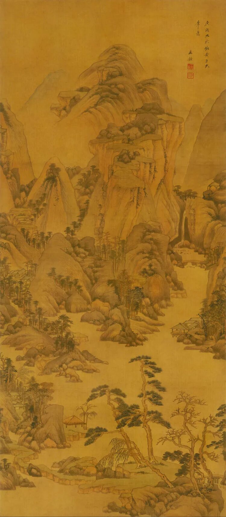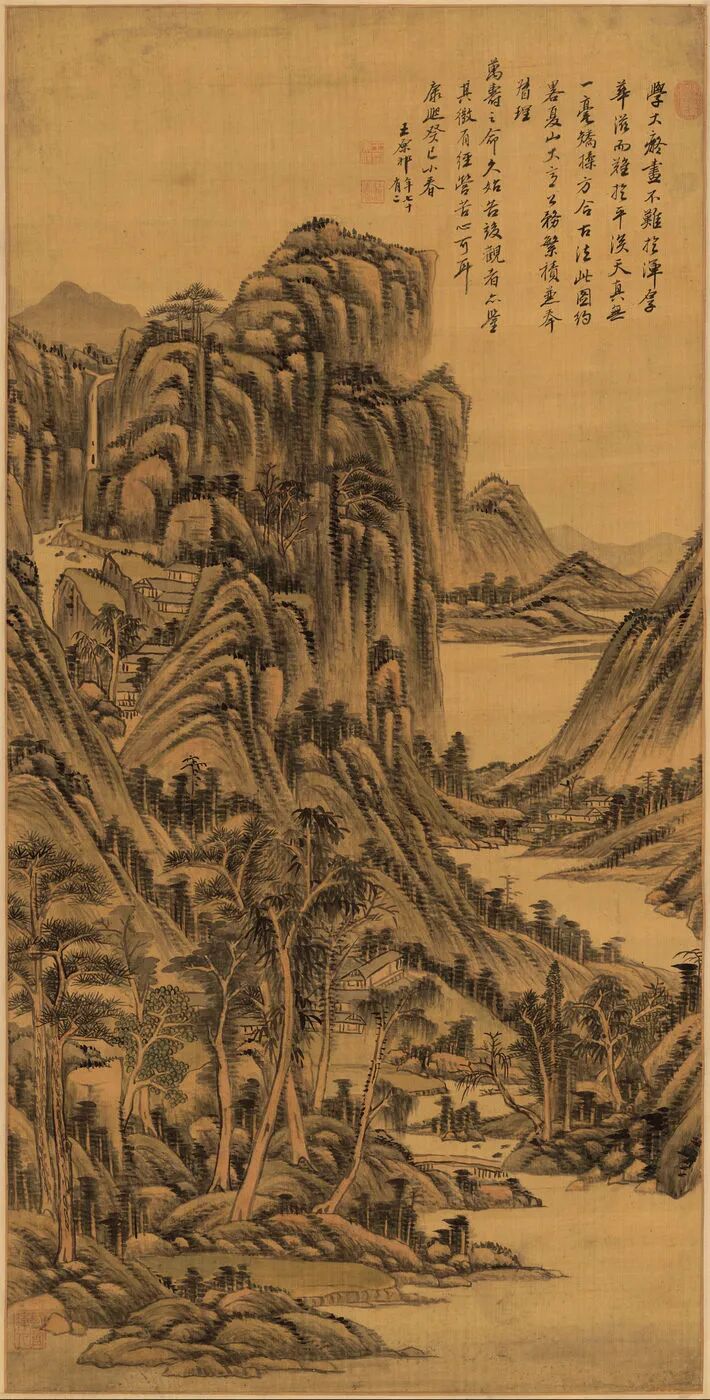 王原祁~高岭平川图,绢本,设色,121x62cm,天津博物馆藏。绘山峰高耸,山峦连绵,雄壮险峻,山涧中瀑布倾泻而下,数座房屋隐于山中,山脚下绿树修长挺拔,河水顺流而下.画上自题:“ 学大痴画,不难于浑厚华滋,,而难于平 淡天真” 。