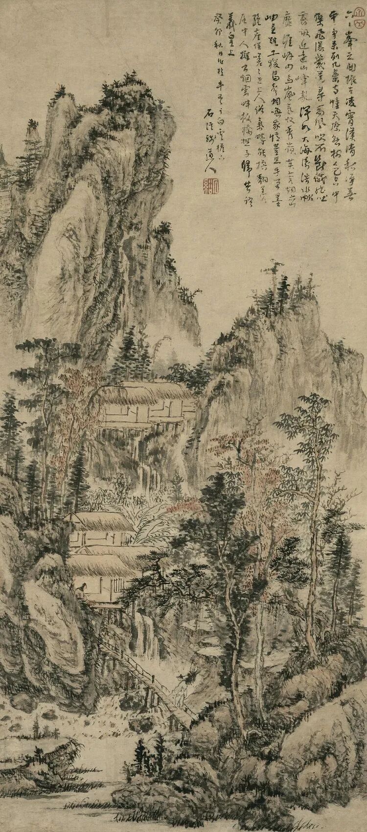 髡残(1612-1673),常德人。擅长画山水,学师“元四家”,并且变前人之法以适自我之意,作品浑厚苍茫。此图景物茂密,意境深幽,尺幅虽不大,却给人以博大雄浑之感,足见作者功力。
