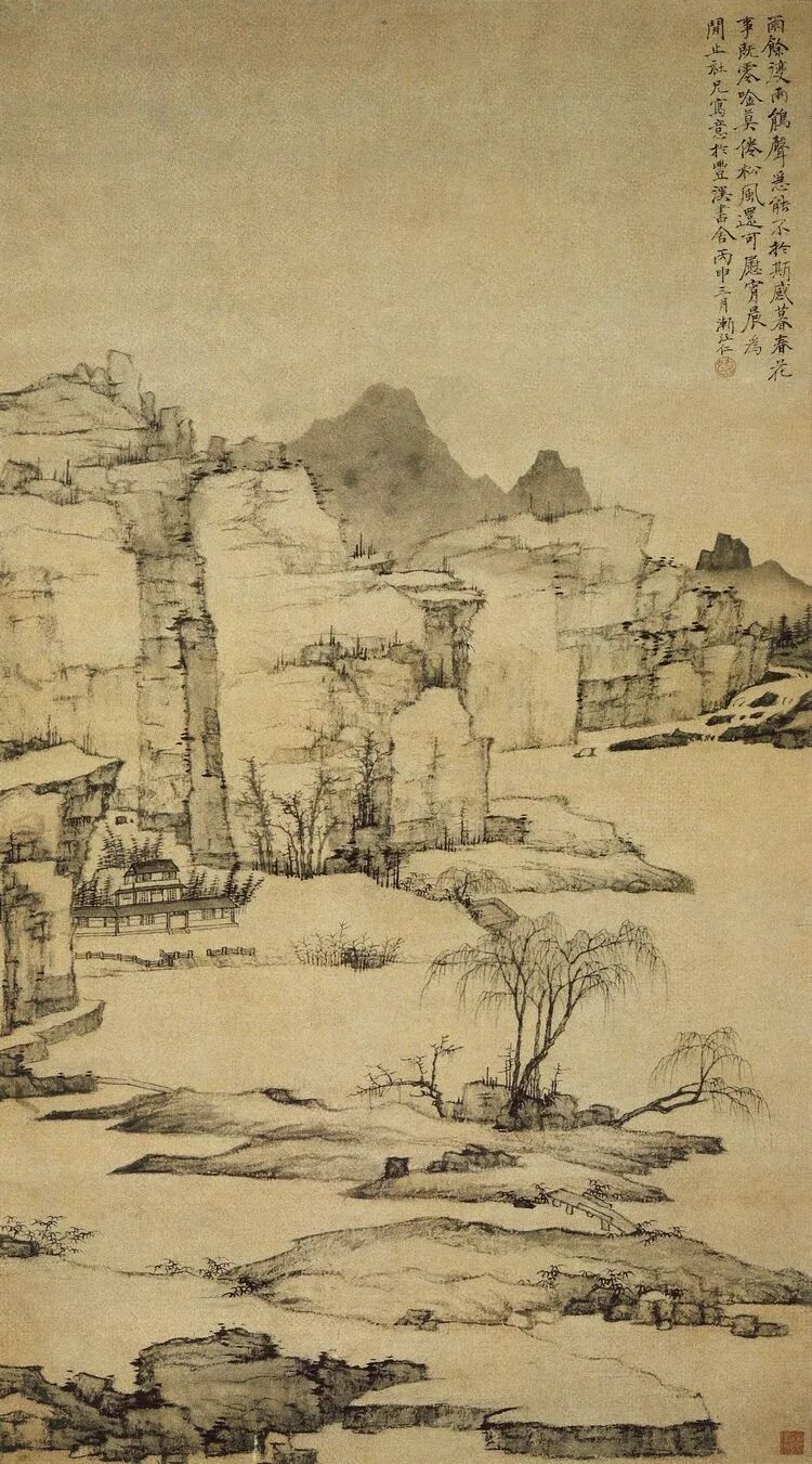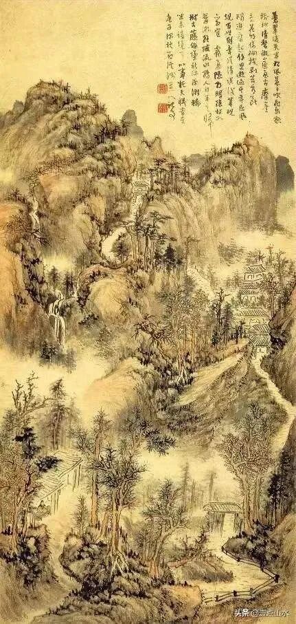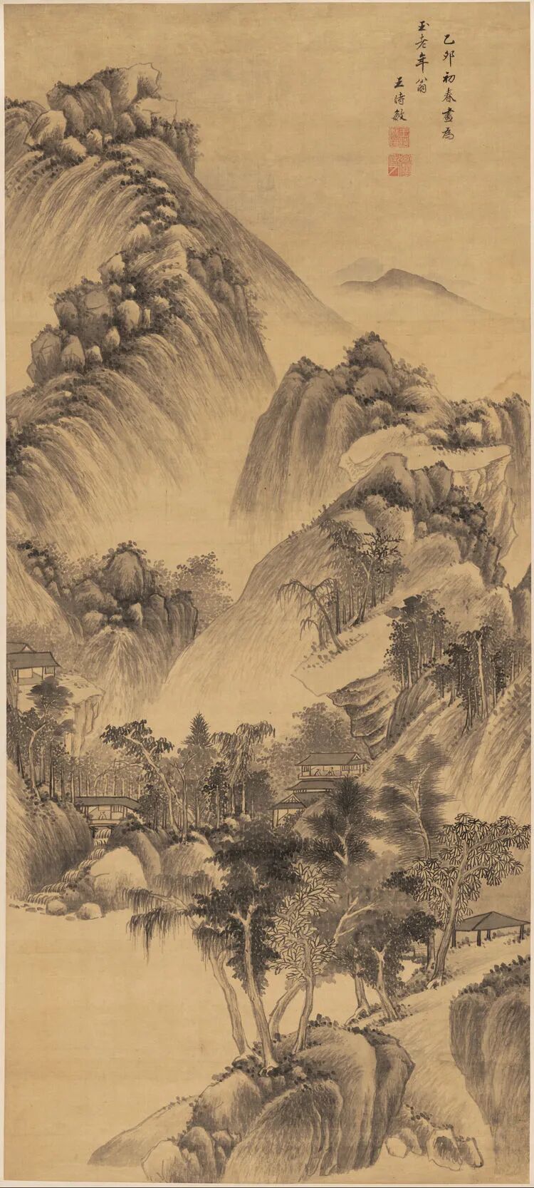 王原祁~山中早春图,纸本,设色,100×45cm,辽宁省博物馆藏。绘崇山峻岭,远处山峰高耸,云蒸霞蔚,近坡处疏树错落斜致。层次深远,纵向逶迤。风貌近于黄公望,构图平中带险,笔法苍润,气韵生动。王原祁,字茂京,号麓台,与王时敏、王鉴和王翚合称“四王"”。