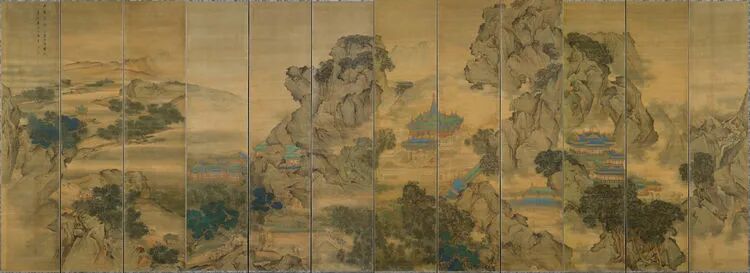 袁江~九成宫图,组屏 绢本 小青绿 120x360厘米,此十二巨屏绘九成宫图,崇山巨岭中布置雕栏玉砌之宫室楼台,全幅界画严整,景色通幽,是袁江传世界画精品。