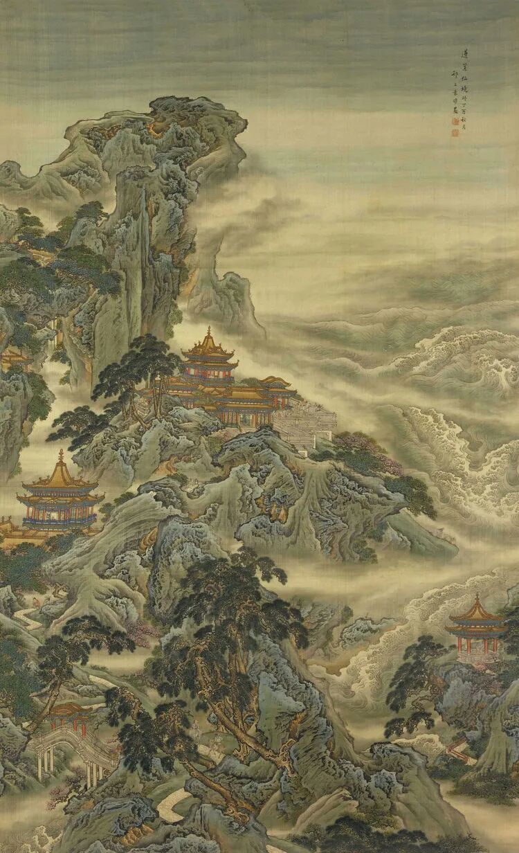 袁耀~蓬莱仙境图,立轴 绢本 设色 266.2x163厘米,袁氏父子(叔侄)画蓬莱仙境的作品很多,以本幅袁耀所作最为壮观。图中山形脉络皆有动势,突兀怪异;以鬼面皴法画出的山石奇形怪状,层次丰富。华丽严整的宫殿与雄伟而富有动感的山水巧妙地融合,浑然一体,形成画面中动与静、整齐与活泼的鲜明对比,气势博大。