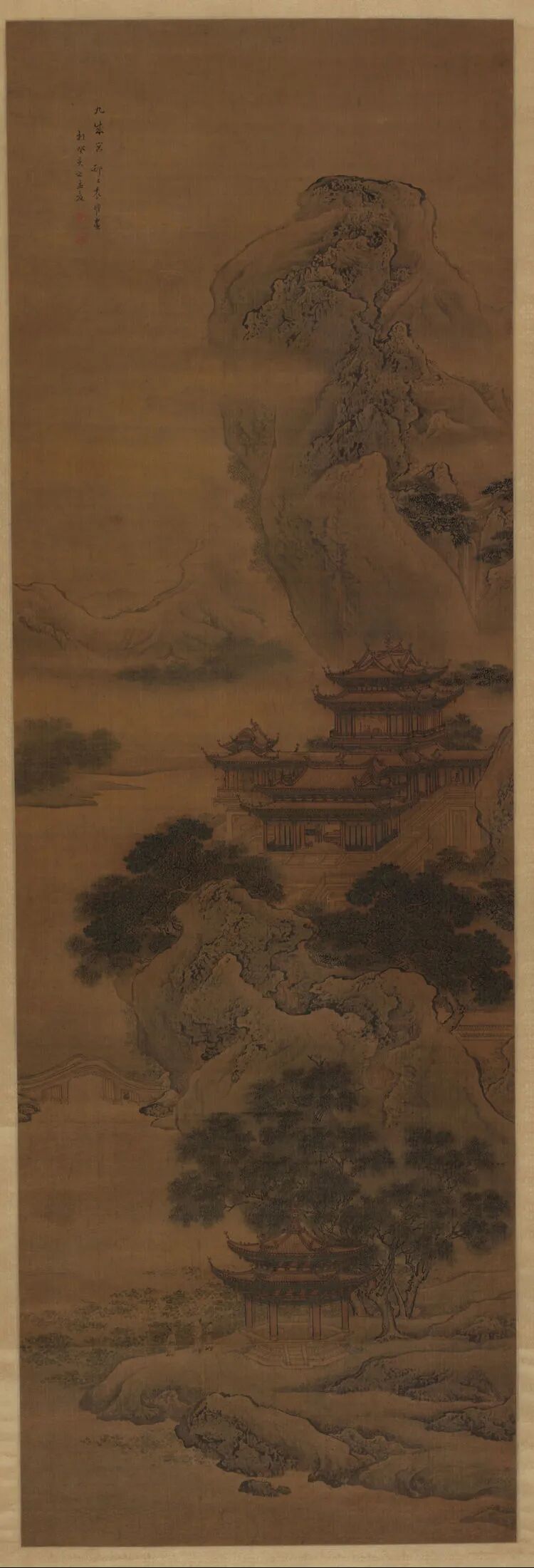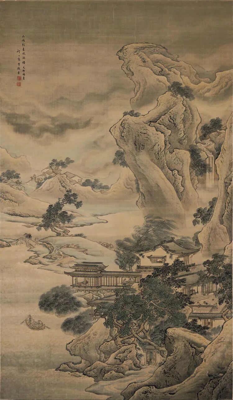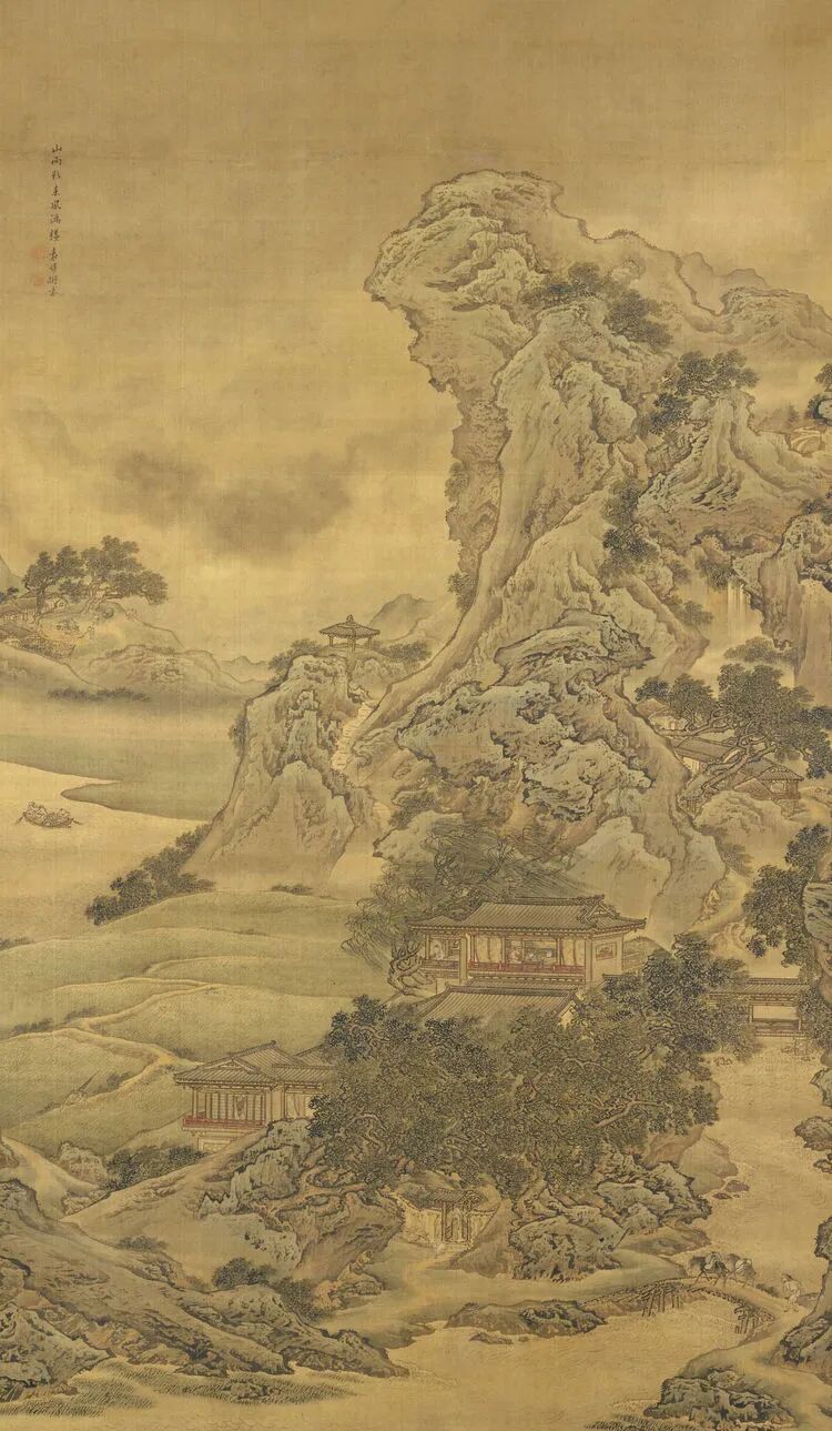 此图绘著名的九成宫,传李世民于此用杖捣出醴泉而出名,欧阳询有《九成宫醴泉铭》碑传世。袁耀用界画画出宫殿高阁,配以仿宋人山水,造景如同仙境,美轮美奂。
