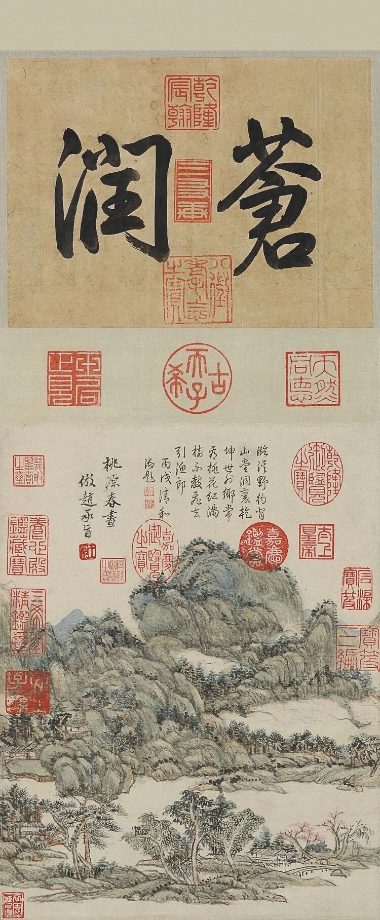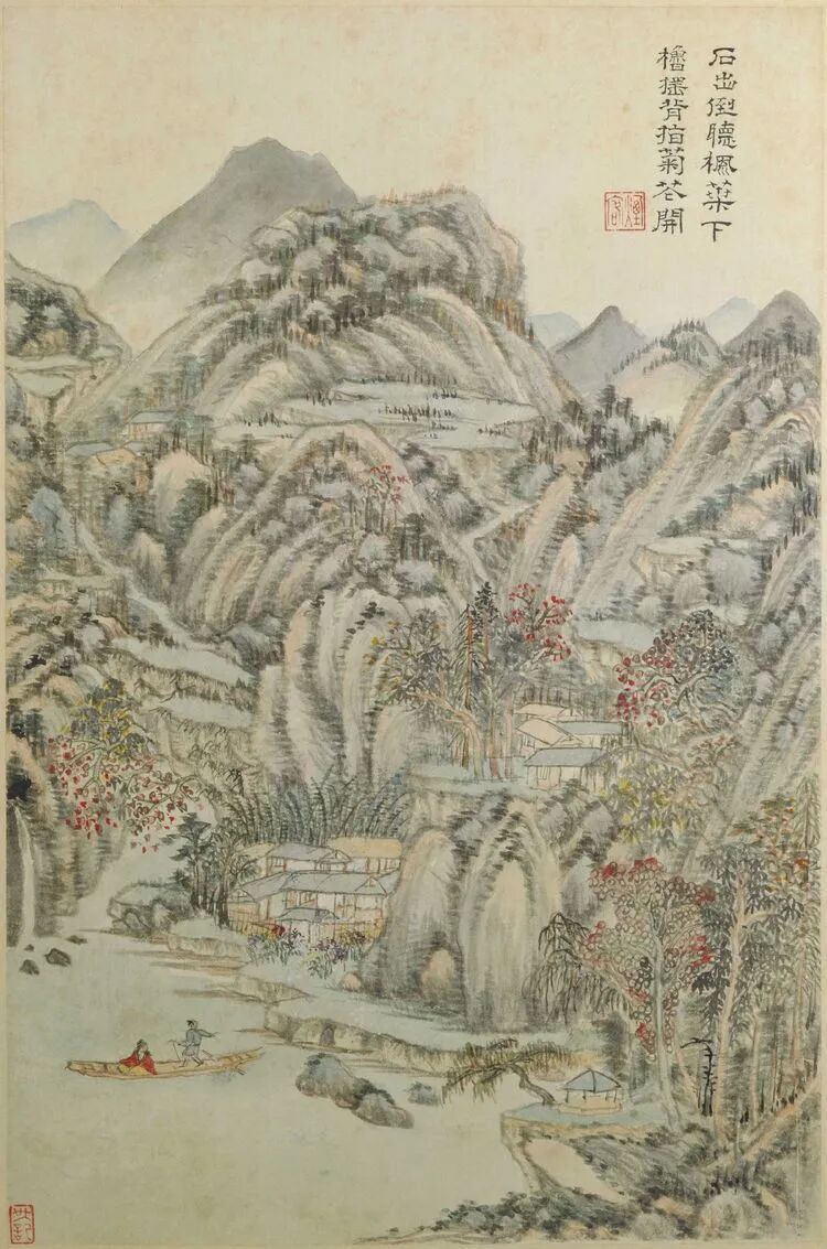 王原祁~桃源春昼图,纸本 设色 138.5x67厘米,藏:纳尔逊-阿特金斯艺术博物馆此图以陶渊明诗《桃花源记》之意境,绘江南初春景色。此时一派春意盎然,满山花红柳绿,桃花灼灼,朵朵艳丽;山脚下河水流淌,岸上平坦处数座房屋映入眼帘,此处实乃令人神往。