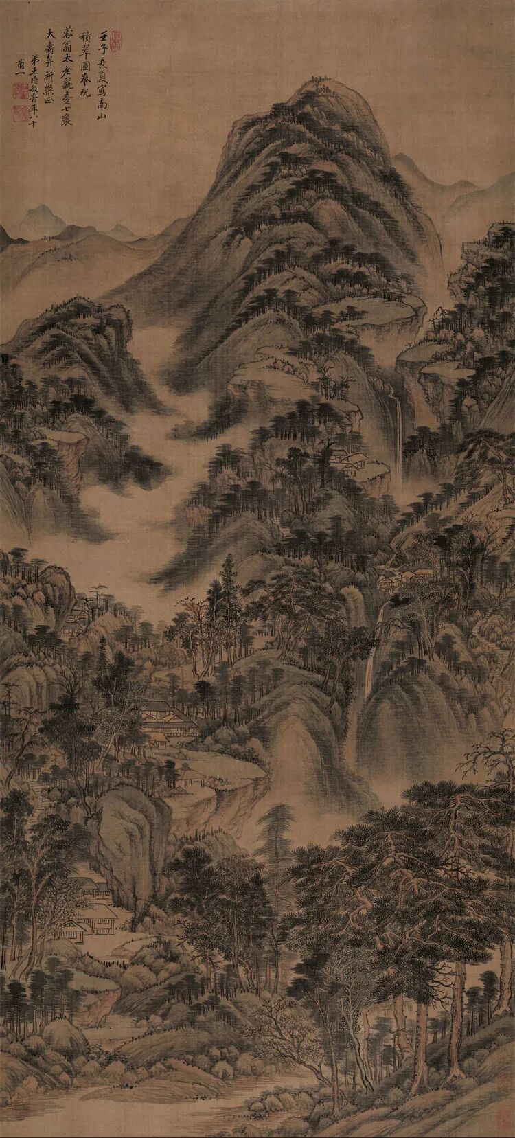 王时敏~南山积翠图,绢本,设色,147.1*66.4cm,辽宁省博物馆藏。绘南山松柏常青苍翠,寓意“长寿”,远处山脉连绵,云雾穿插山间;山中松柏苍翠,林中楼阁隐约显现,一泓瀑布如白练倾泻;山脚水流潺潺,积翠葱芊。所绘山石结构颇似黄公望,树木、山峦又近于王蒙。