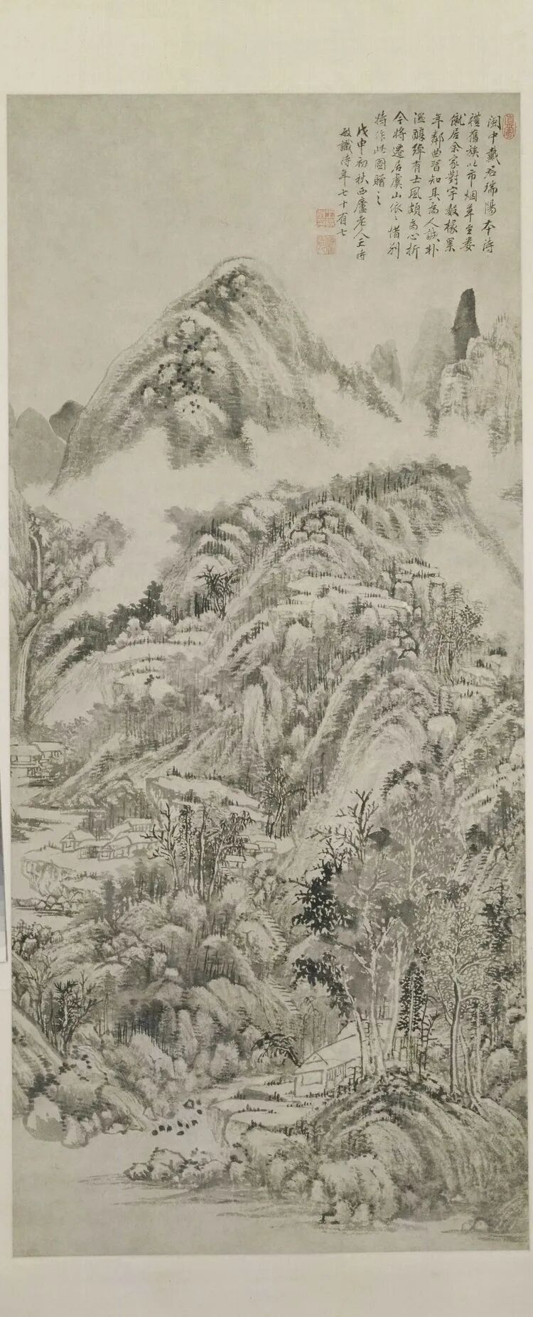 髡残~溪山秋水图,纸本,设色,113*50cm。图绘雨后山中景色,山峰高耸,挺拔险峻,树木茂密,雨后更加苍翠;山中多座茅屋,为观景清修绝佳之所,髡残,清初僧人画家,山水承王蒙画风,并与八大山人(朱耷)、弘仁(渐江)、石涛合称为“清初四大画僧”。
