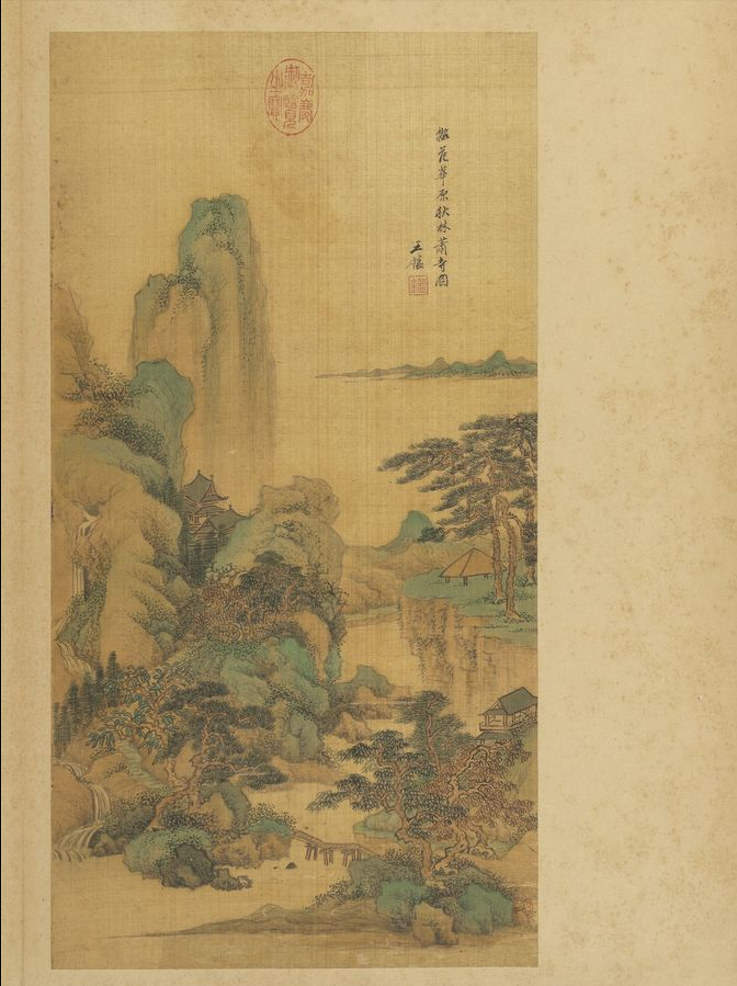 本,设色,59.2x82cm,台北故宫博物院藏。此图以范宽《秋林萧寺图》为本,绘数峰高耸,古木苍松,楼阁亭台掩印山涧之中,一帘瀑布倾泻而下,汇入山脚向前流淌,此幅比原画更显绿意。画上自题:拟范华原秋林萧寺图,王鉴。