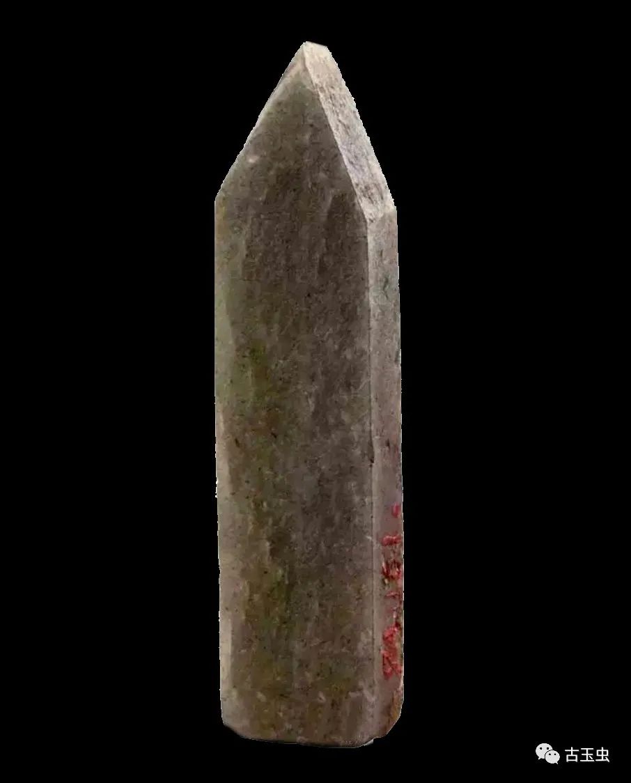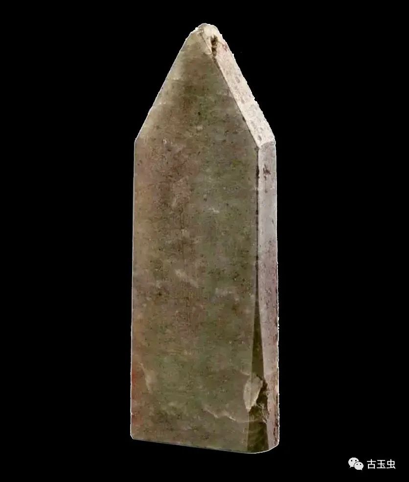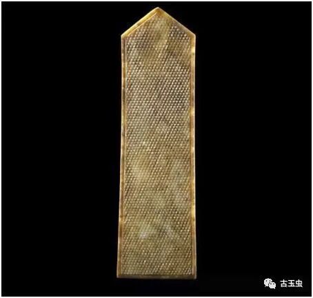 黄绿色。长条形片状,剡上方下。双面刻五行谷纹,谷纹为圆泡形。出土时附有一个6.4厘米高的黄绢套子,置于墓主头部左侧。