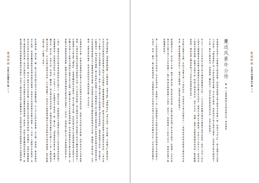 本书由上海博物馆工艺部主任施远作序,他说:“本书中许多扇骨的原件都已成为上海博物馆的庋藏,也是笔者学习和研究竹刻艺术与历史的第一手资料,正是从这个意义来说,笔者认为本书是一部‘著作’,它可以引领我们更真切、更顺利地进入竹刻扇骨鉴赏的领域。”