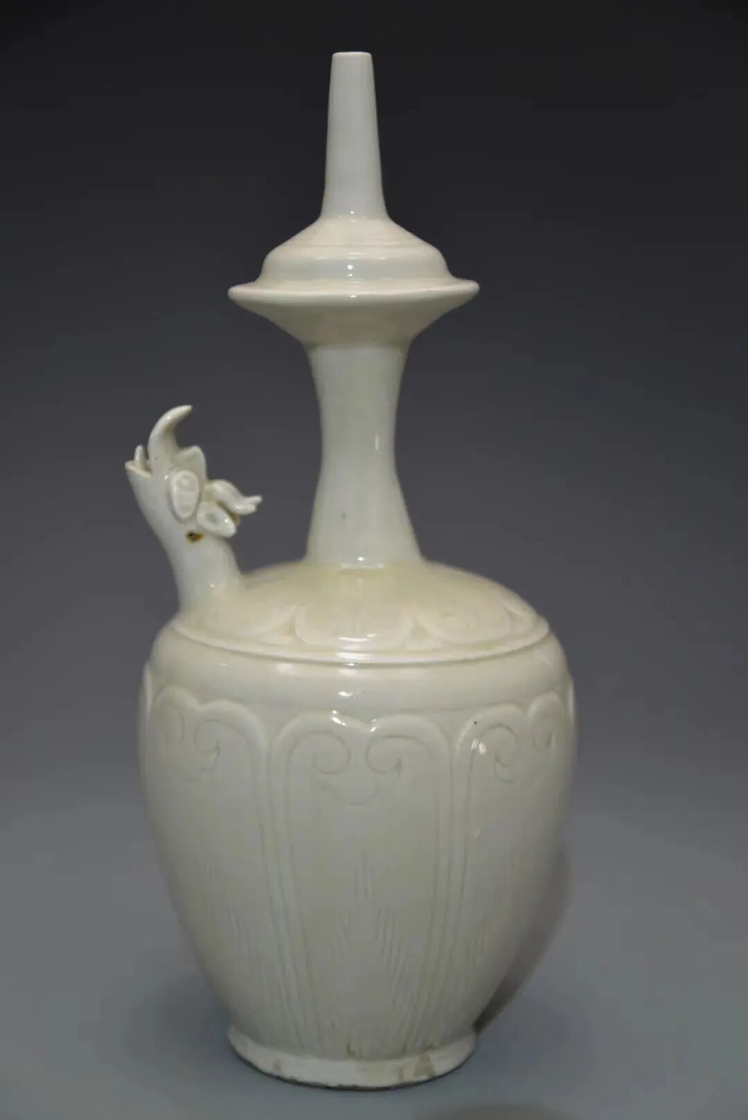 随着佛教的发展,军持成为佛教法器。其相轮形凸棱和细长颈的组合就像一座佛教的尖塔,透出宗教般的宁静,给人一种宗教的肃穆感,其中以北宋早期定窑所产军持为最。《发现定窑》所展出的北宋定州塔基地宫出土的净瓶就是典型的代表。