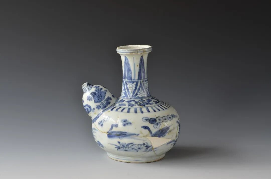 明清时期,我国瓷器外销空前繁采。景德镇成为了全国的瓷器生产中心。明清时期的军持生产以景德镇为主,品种多样,有青花、五彩、斗彩、单色釉等等,这一时期生产的军持仍以外销为主,专供国外伊斯兰教教徒使用。此件军持即为明代景德镇的产品。2004年出土于一个灰坑中。口径5.8cm、腹径13.6cm、足径9.6cm、高18cm。受明代总体敦厚的艺术风格影响,腹部鼓圆 、直颈较粗短、丰满的乳房状流。器身绘三鸭戏游,周围莲荷相间,装饰生动,别有趣味。