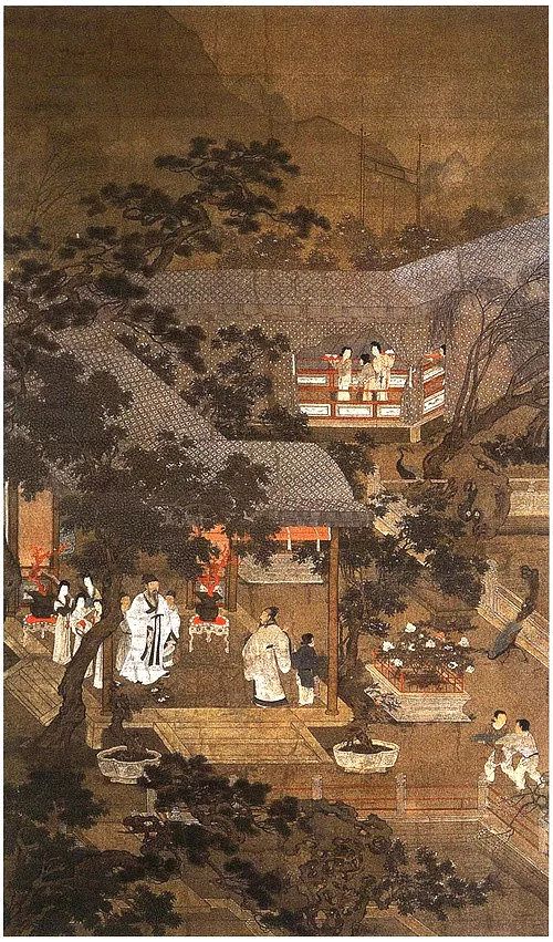 明·仇英绘《金谷园图》,画中园林奇花异木皆备,珍禽悠然自得。园主石崇与众人娱乐,神态悠然。