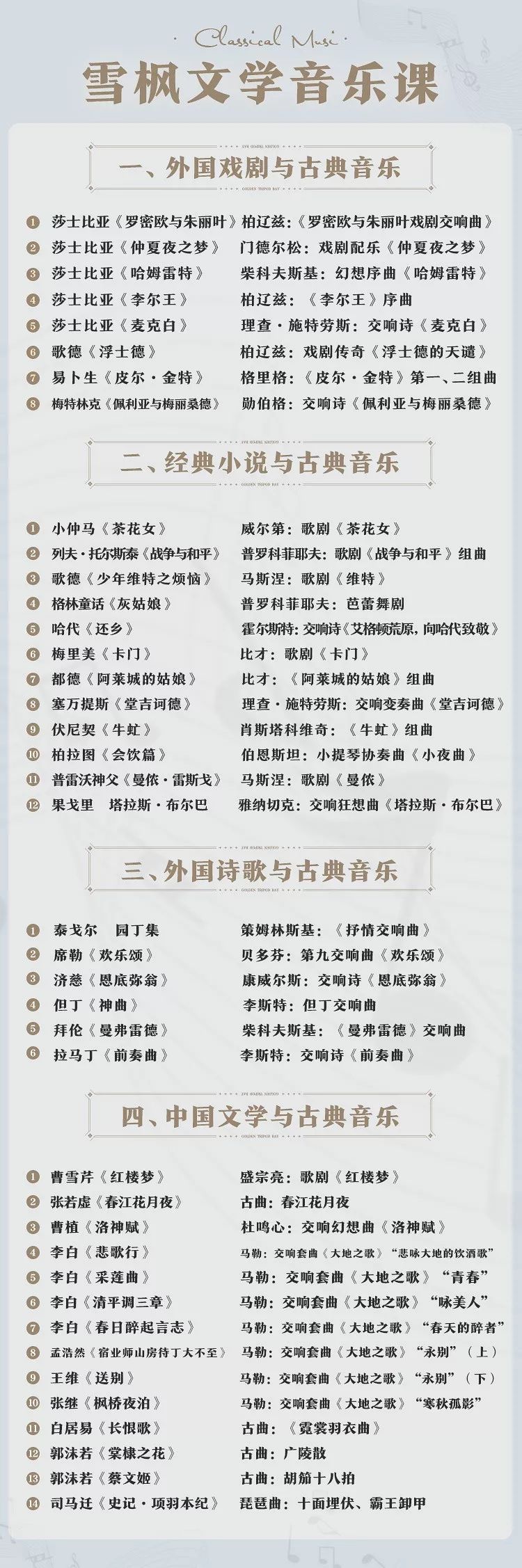 聆听2万张唱片,只挑中50首古典音乐:游历十余国,探访几十个作家及作曲家故居,雪枫最后只精选了50首根据文学作品改编的音乐,堪称经典中的经典。