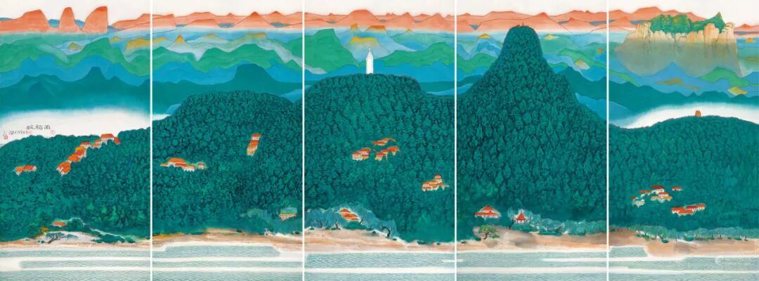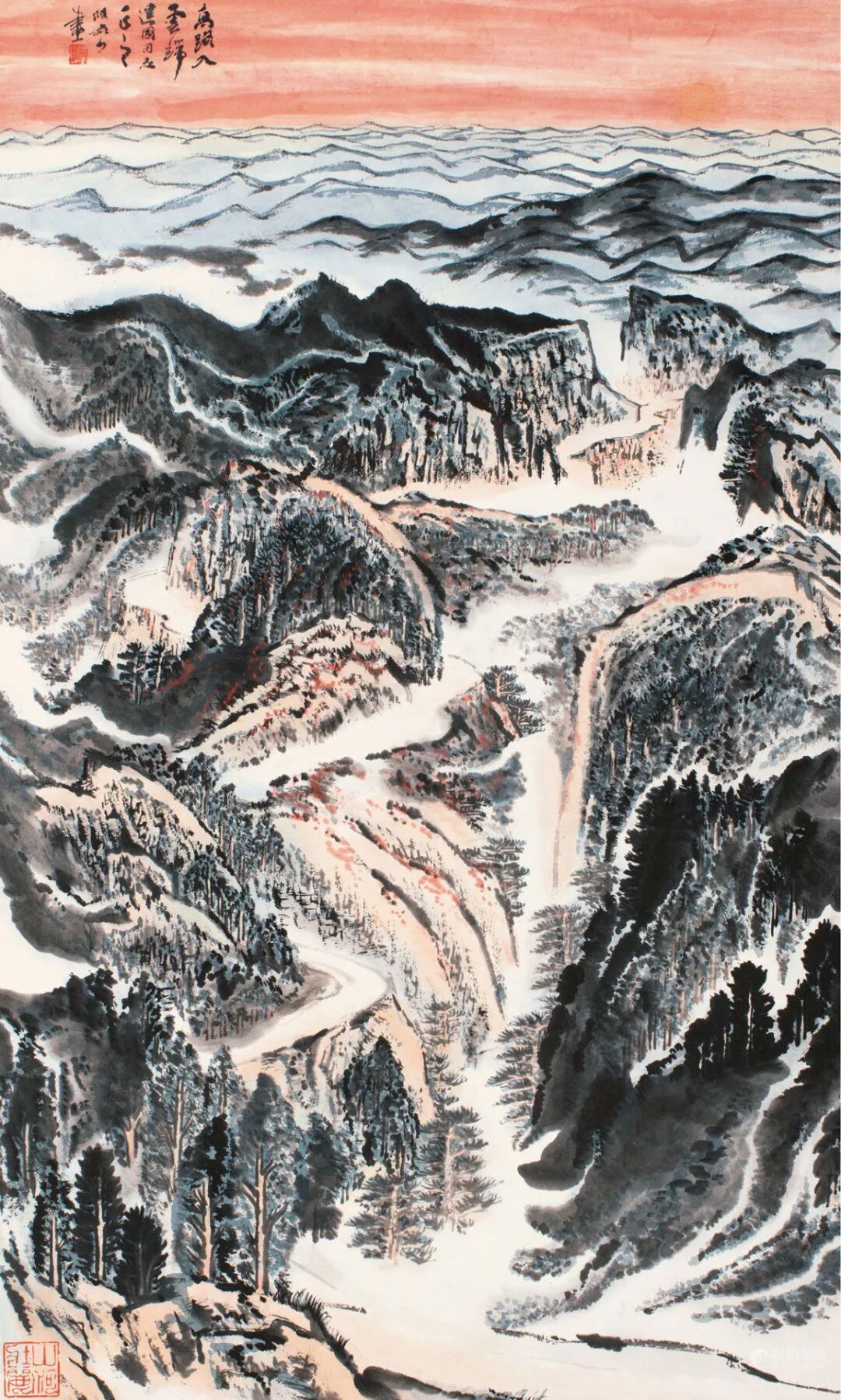 Lot 288 陈家泠(b.1937) 2021年作 西柏坡《西柏坡》属于陈家泠的扛鼎之作,是馆藏级红色题材系列作品。陈家泠笔下的西柏坡,在“圣地山水”的神圣光环之外,使观者拥有“可居、可游”的审美体验,红瓦绿树、碧波浩渺,好一处诗意的栖居之所;沟壑崖壁、峰峦叠嶂,又不失掷地有声的力量感。画面中央的白塔红星熠熠生辉,传递着希望的光芒,正是这光芒照耀了中国前进的道路。画面上群峰苍翠、山川秀美,壮美、崇高、气度得到了充分体现,观者更能从中体会到昂扬向上的生命力。正如陈家泠所言,他表现的是祖国朝气蓬勃的万千气象,把山川的郁郁葱葱融入在历史的厚重和时代的空间里。