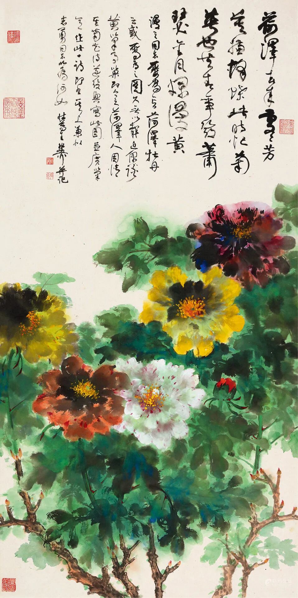 题识:菏泽春来处处芳,莫嫌蜂蝶此时忙。菊英也共春争发,萧瑟金风灿漫黄。漫之同志屡为言菏泽牡丹之盛,属为之图久无以报,近偶谈黄巢事,巢即今之菏泽人,因忆其菊花诗,遂发兴写此图,并广巢合作此一诗,即书其上,兼似志永同志以为何如。壮暮生稚柳并记。钤印:谢稚、稚柳、鱼饮风腕、池上楼、苦篁斋落墨、鱼饮1.《谢稚柳画集》P78,上海人民美术出版社1981年出版。2.《谢稚柳系年录》P128,上海书店,1991年8月出版。3.《谢稚柳系年录》增补本P145,上海书店,2009年9月出版。4.《华人收藏京沪收藏家藏品邀请展图目》图365,2010年11月出版。5.《烟江秋兰》谢稚柳陈佩秋作品集P119,上海人民美术出版社,2015年12月。说明:上款人曹漫之蔡志勇夫妇,曹漫之(1913-1991),山东胶东(今平度市)人。曾任建国后上海市第一任民政局长及中共华东局副秘书长等职,与谢稚柳陈佩秋夫妇友谊甚深。注:此作于2021年10月8日经谢稚柳陈佩秋之子谢定琨先生鉴定为真迹。