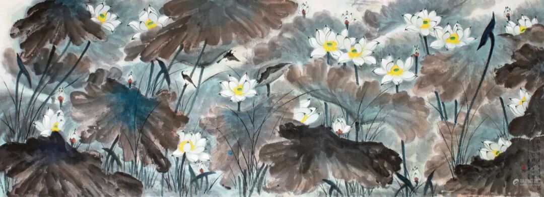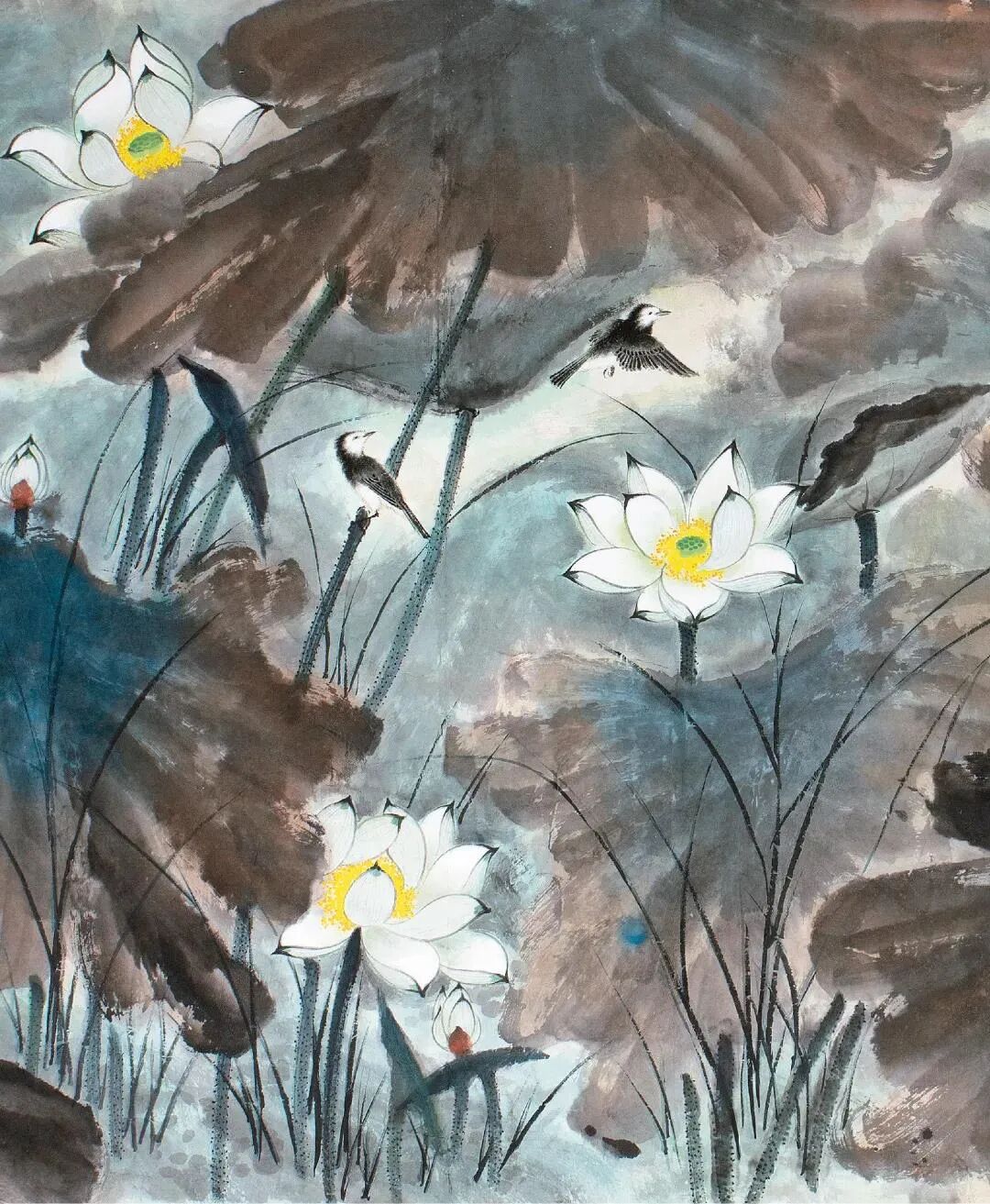 此画以大写意铺写荷叶,再泼以青绿重色,色墨相融,气魄宏大,气韵天成。画中荷叶高低错落,掩映交叠,甚有“接天莲叶无穷碧”之妙。素荷黄蕊,风姿绰约,隐现于墨色间。荷叶起舞,千姿万态,如风掠池塘,清逸中别具气势。花叶作鹡鸰一双穿行,笔法高古,极得宋人遗韵,生机勃勃,逸趣横生。谢老作画极善对比,荷叶用笔纵逸潇洒,与荷花的勾勒形成对比;用色则以荷叶厚重清雅的墨绿与白色花头的庄严洒脱形成对立,令画面产生韵味无穷的生机……而这一切,最终则统一于画家雅擅的清丽高逸的格调之中,足称大手笔。