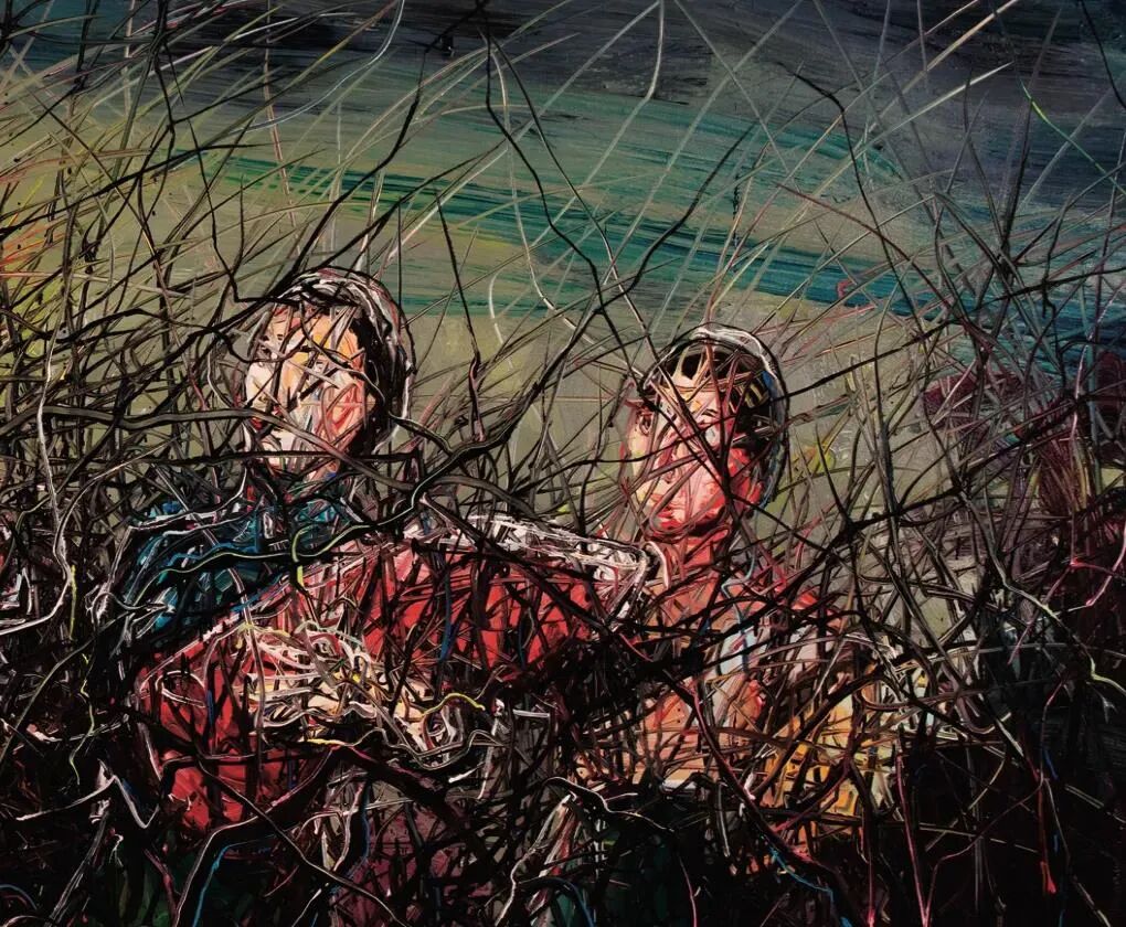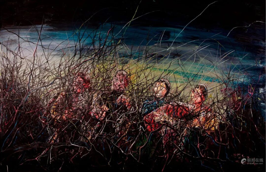 签名:曾梵志 2007 Zeng Fan Zhi (右下)2.2009年首届中国当代艺术收藏家年会暨中国当代艺术收藏家藏品邀请展宋庄和静园艺术馆/北京;3.2014年守望经典对话当代艺术北京艺术博览会全国农业展览馆/北京。沙家浜的故事情节脱胎于1939年的一个真实的事迹,叶飞率领江南抗日义勇军离开苏常地区后,留下了36名伤病员,他们在地方党组织和群众的支持帮助下,不畏艰苦,重建武装,坚持抗日斗争。在曾梵志的画中,我们则看到了另一个完全不一样的氛围,灰冷的天空,压抑得让人喘不过来气,乱草基本上遮住了人物的面容,凌乱、紧张、千钧一发。我们不得不为阿庆嫂他们的命运担忧,在这样的黑云欲催的情况下,他们还能不能脱险。曾梵志将表现主义描绘气氛和精神特质的专长发挥到了极致,我们几乎不用听到声音,看到动作就能体会到环境的紧张空气。风声雨意、浩荡的芦苇、紧张的气氛,这些都是编剧所赋予这一戏剧性场景的气氛,但是在样板戏中,我们好像很难感受这些,有的只是英雄人物的高大全。而曾梵志对经典京剧《沙家浜》的这次再现则成功营造了这一场景的氛围,看似逸笔草草,却蕴含深意,将芦苇化为乱草,既是对乱草系列题材的延续,又是对历史经典的还原,堪称是当代艺术中“挪用”的精彩之作。
