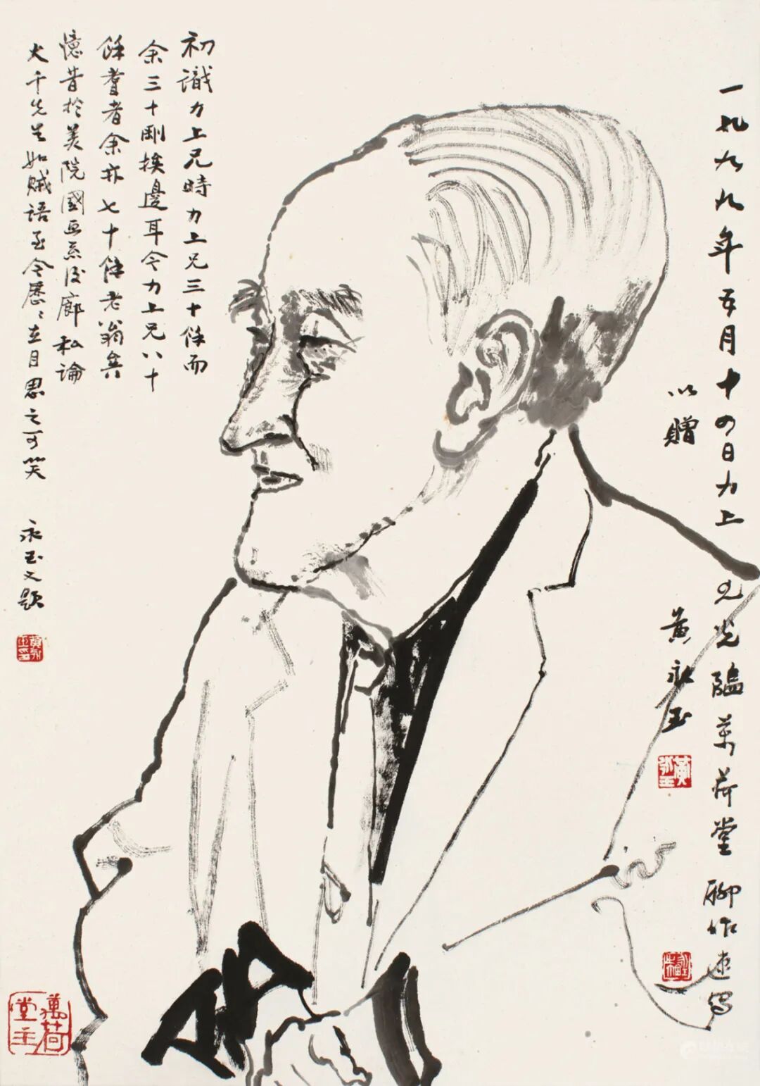 题识:海天旭日浴金秋,宇宙曙光眼底收。松臂满崖齐探手,笑播彩雨绣神州。己巳秋日,洛杉矶度假泼彩忆写黄山西海朝晖,粉白如烟,惊红如火钳,蓝冷如翠,光怪陆离,觉半神未老也,刘海粟九十五岁。钤印:海粟不朽、曾经沧海、心迹双清、子孙永宝、黄山是我师、艺海堂、九上黄山绝顶人注:此作于2021年10月9日经刘海粟之女刘蟾女士鉴定为真迹。「翰墨寄情」为同一上款及同一藏家友情提供作品专场,近200件作品俱为名家旧藏,来源清晰,传承有序,全部为生货精品。本场包括:著名新闻人陆谷苇家属提供其旧藏,涵盖陆俨少、谢稚柳、程十发、关良等名家佳作;俞致贞刘力上之女提供的父母作品及旧藏,包括于非闇、黄永玉等名家作品,值得关注。Lot 495 黄永玉(b.1924) 1999年作 刘力上画像1.一九九九年五月十四日,力上兄光临万荷堂,聊作速写以赠,黄永玉。2.初识力上兄时,力上兄三十余,而余三十刚挨边耳。今力上兄八十余耆者,余亦七十余老翁矣。忆昔于美院国画系后廊私论,大千先生如贼语,至今历历在目,思之可笑。永玉又题。说明:Lot 464 - Lot 497 为刘力上、俞致贞家属友情提供。