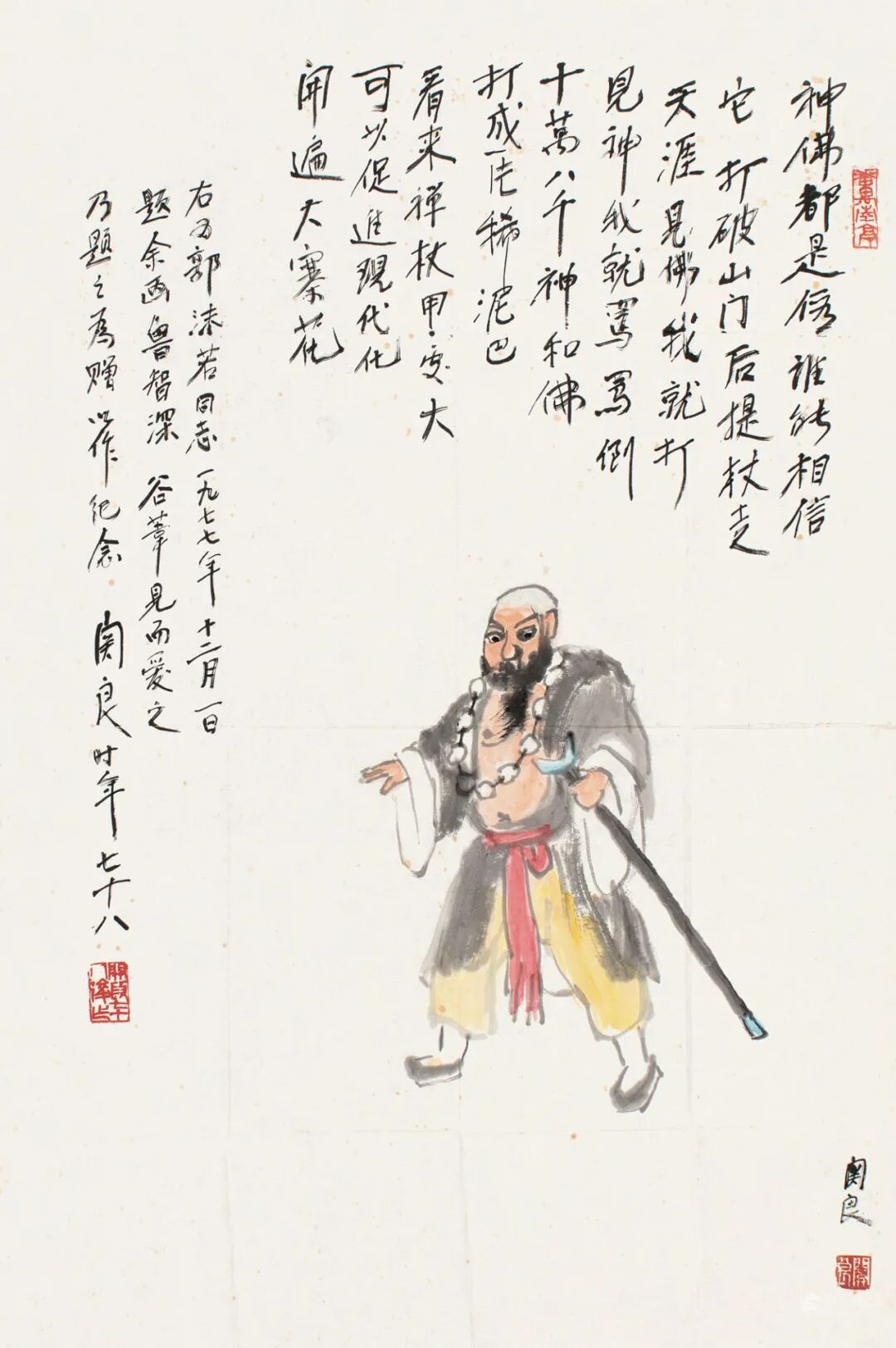 Lot 384 关良(1900~1986) 鲁智深醉打山门1.神佛都是假,谁能相信它?打破山门后,提杖走天涯,见佛我就打,见神我就骂,骂倒十万八千神和佛,打成一片稀泥巴,看来禅杖用处大,可以促进现代化,开遍大寨花。右为郭沫若同志一九七七年十二月一日题,余画鲁智深,谷苇见而爱之,乃题之为赠以作纪念,关良时年七十八。2.Lot 331 - Lot 424 为陆谷苇家属友情提供。