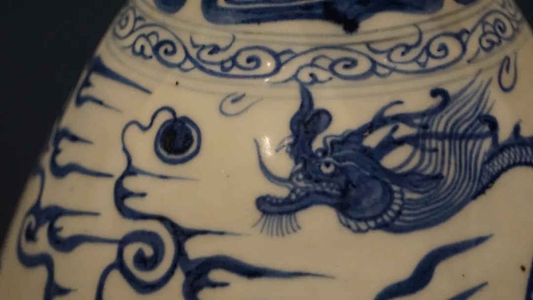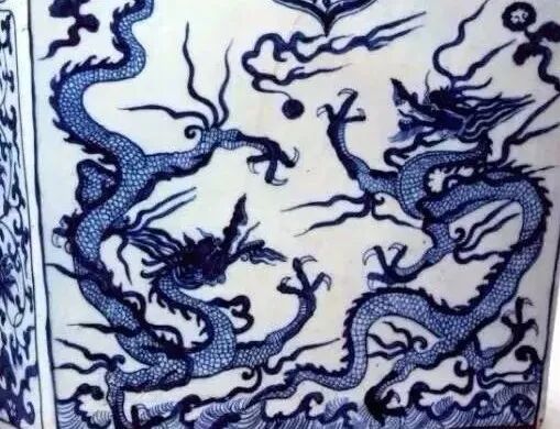 总的看,元青花龙纹头凶小、颈细长、体壮实、身修长,嘴长张口(多见猪唇长嘴)、角多似(梅花)鹿角,龙头颈部多有飘逸向上斜向后的鬃毛,背鳍如锐利的锯齿,龙鳞有斜方格状、鱼鳞状,龙爪画得强劲有力、细长弯曲、爪尖锋利、状如镰刀,一般有三爪、四爪,五爪较为少见(元代朝廷曾下令禁止民间使用五爪龙图案),龙尾一般似蛇尾。