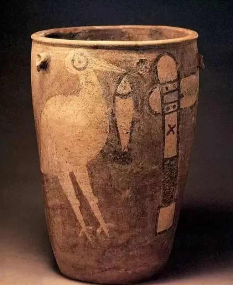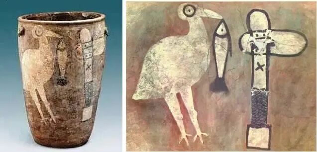 陶缸属新石器时代仰韶文化类型,作者用白色在夹砂红陶的缸外壁绘出鹳、鱼、石斧,以粗重结实的黑线勾出鹳的眼睛、鱼身和石斧的结构。
