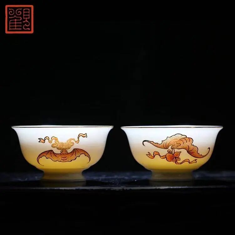此对杯胎土非普通瓷土,以更为洁白的玉土为胎,油润如脂,在灯光下呈如玉透感。矾红与金彩组合,彰显祥瑞之气。以纯金制成的颜料为纹饰进行描金,用玛瑙刀抛光,可越抛越亮,极具收藏乐趣。