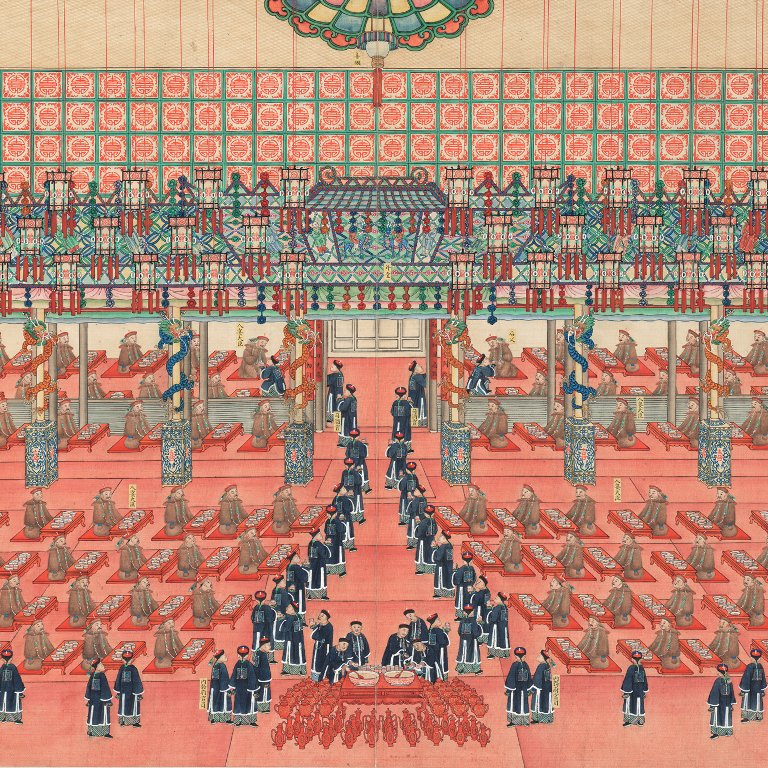 婚礼所用物品十分繁巨,单从瓷器项便可窥一斑。大婚用瓷的筹划时间较其他更为提前,同治五年,官方筹银十三万两,于景德镇复建御窑厂,同治六年,宫廷造办处正式交下为同治皇帝大婚预备皇后需用瓷器的活计画样,共计十四份又九项花色。