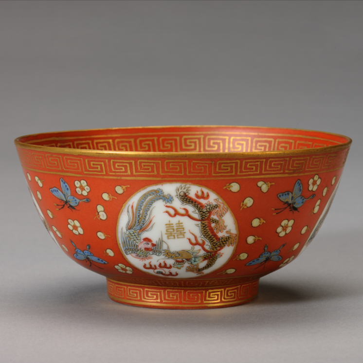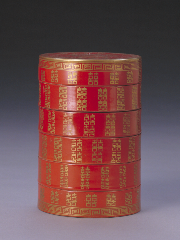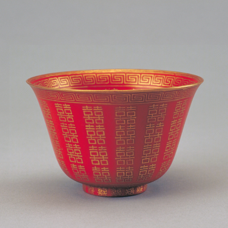 这种倾向橘色的矾红,与金彩同时使用,会形成一种更加热烈的喜庆之气。同治大婚中,出现了一大批金彩装饰的“囍”字纹饰,“囍”字人们习惯称之为双喜,据传为宋代王安石所创,因成双成对,遂成了后世婚嫁中标志性的吉庆纹饰。