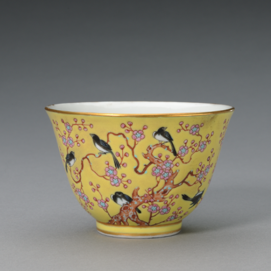 大婚用瓷中体现皇家尊严的黄地彩瓷数量最多,图案纹饰寓意吉祥,如漫天飞舞的蝙蝠代表“洪福齐天”,蝙蝠与描金团寿字组合为“五福捧寿”,喜鹊与梅花构成“喜鹊登梅”等。