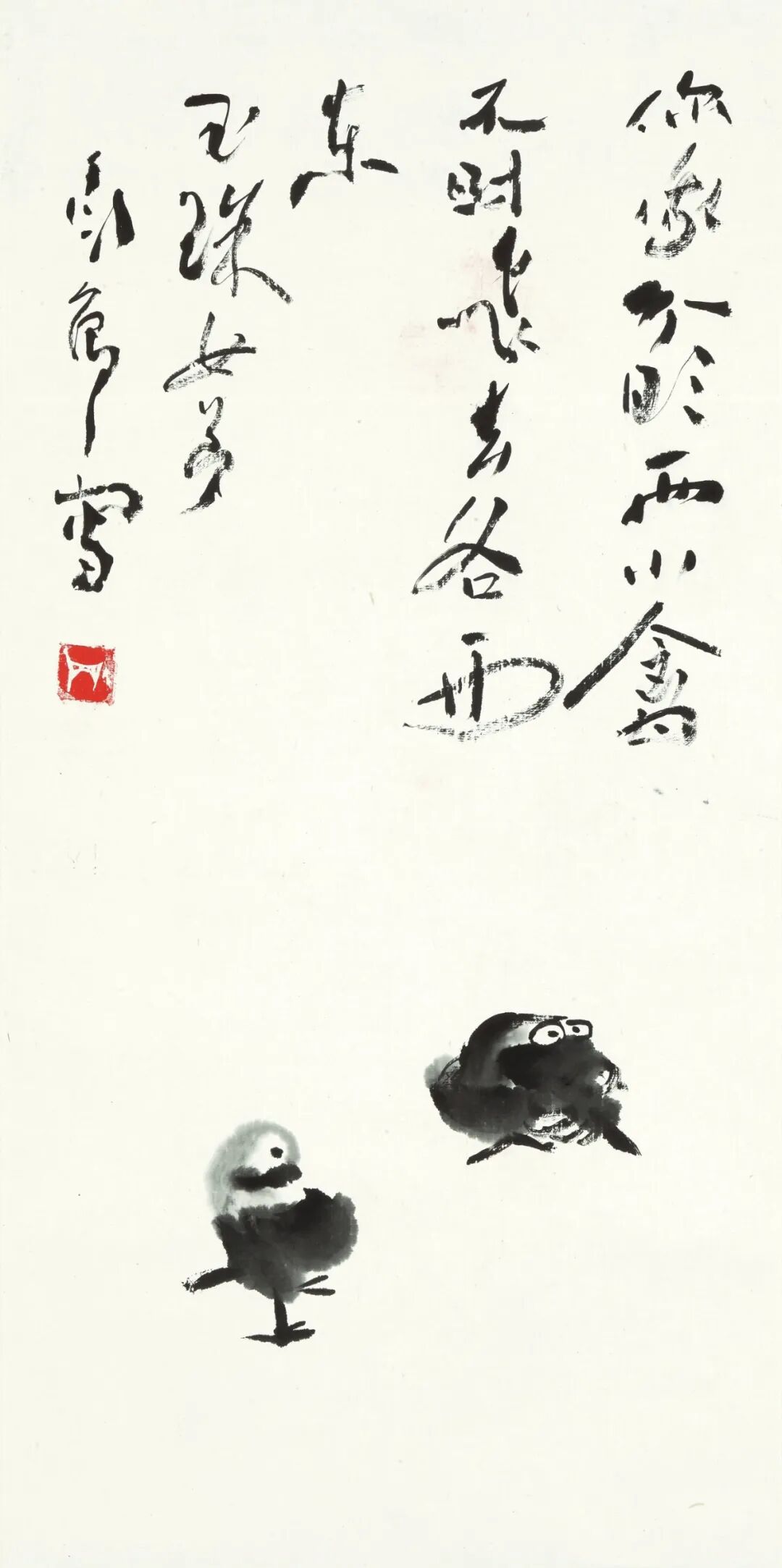 丁衍庸这幅水墨小鸟,当然是在致敬八大山人了。