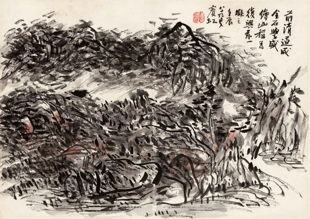 这幅《嘉陵江上》正是这一时期的精品。作品用浓重的笔触涂抹出山峦、江流和行船,虽然运用了不少传统水墨画的技巧,但更多是色光感的意境,满是忧郁、沉闷的情调。