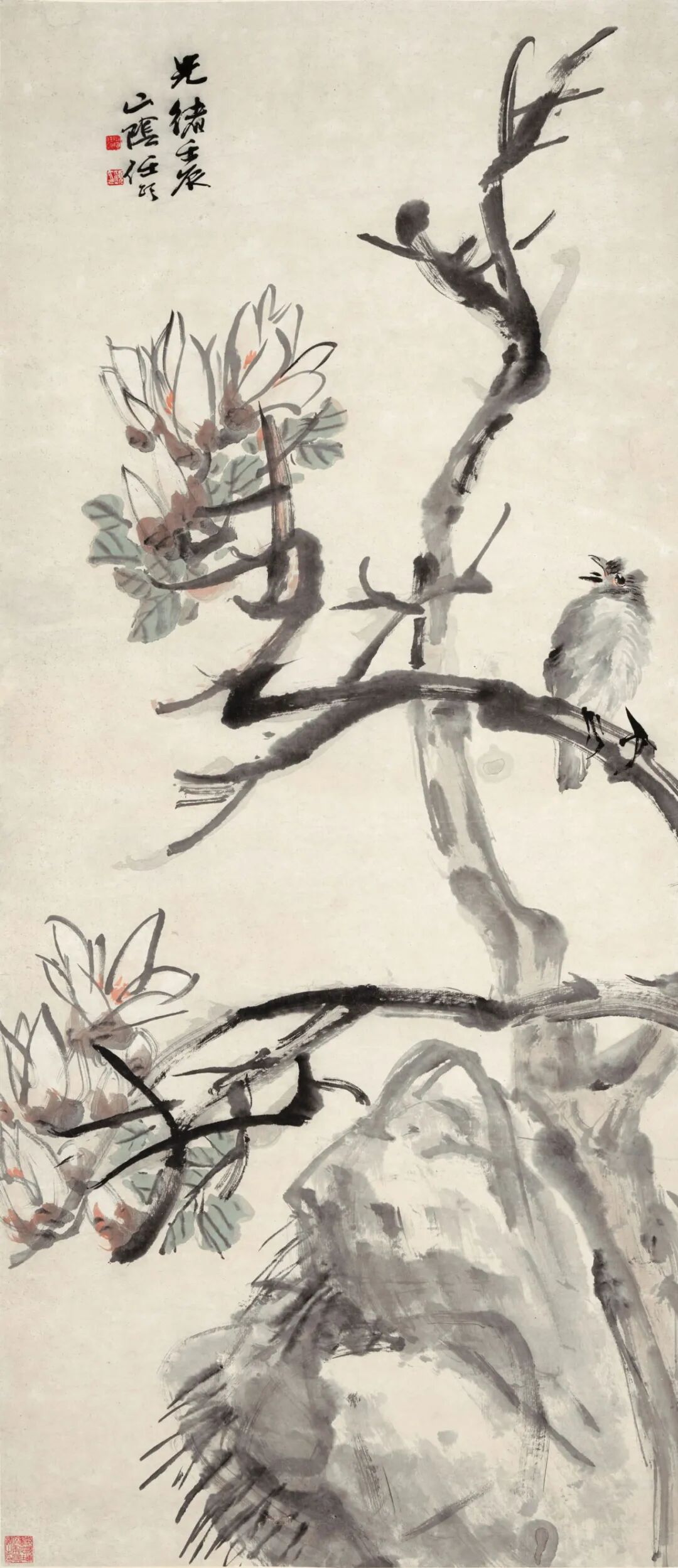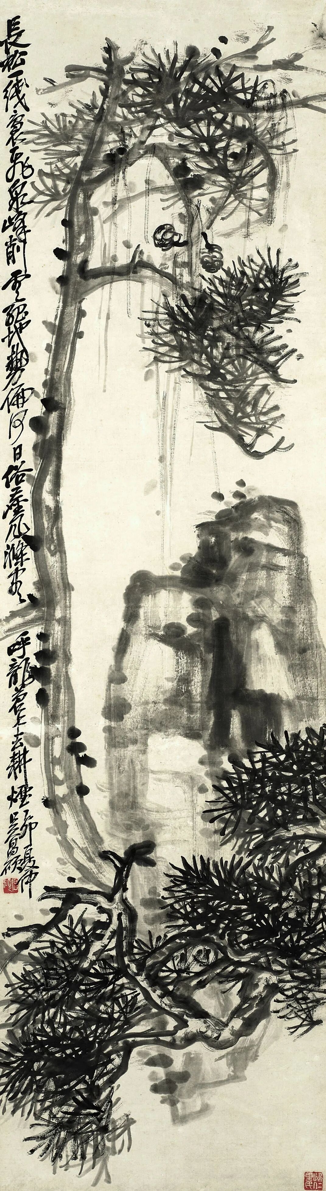 比如他的这幅《松石图》,树干树枝的长线条,自上而下,一贯到底,并且首尾呼应。松树树干的苍茫虬劲、松叶的俊挺峭拔,没有极其雄强的笔力根本做不到。石头也用圆浑之笔取代方折套路,富有篆书的韵味。