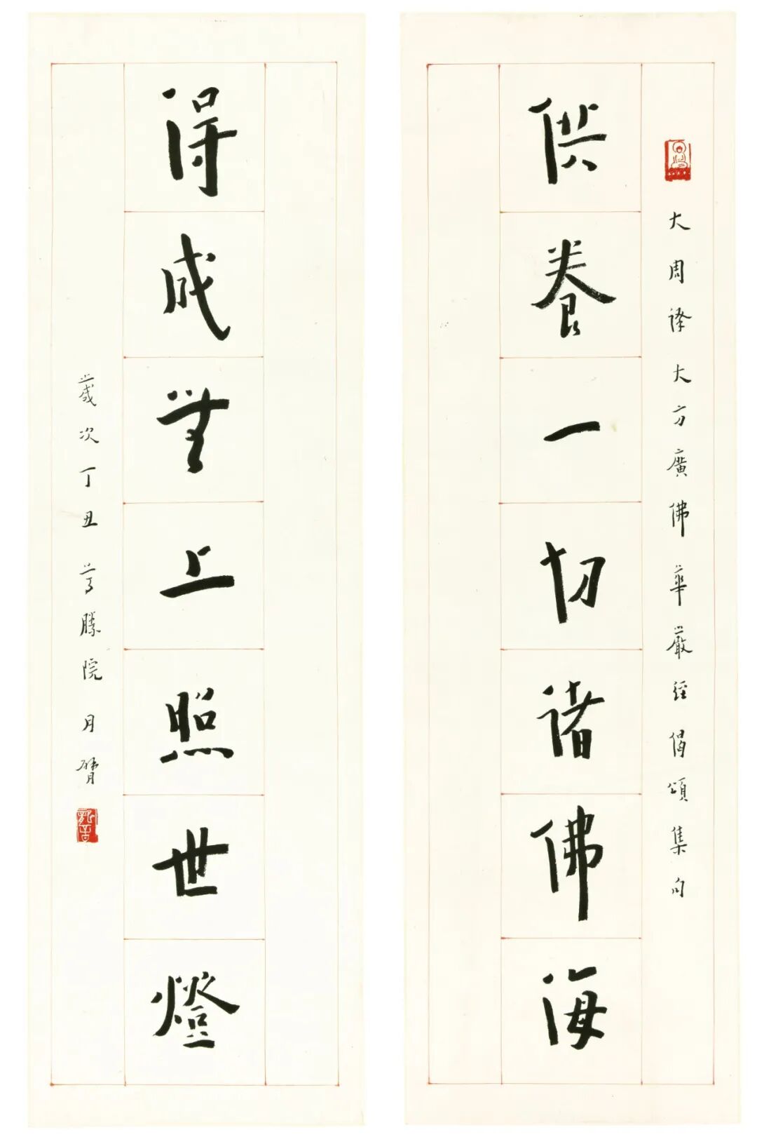这幅弘一法师李叔同的对联是他晚年作品,用笔既非魏碑,也不是帖体,已经碑帖两忘,简到极致。