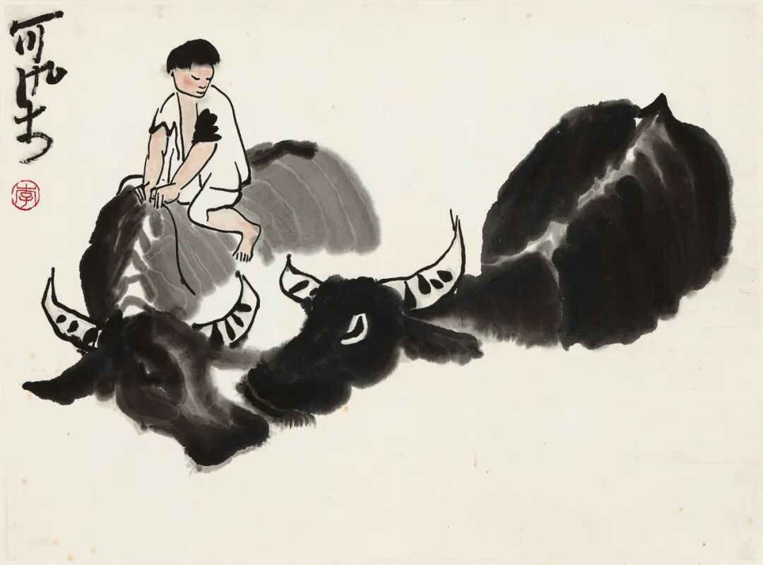 比如这幅水牛图,别人的牛都是用线勾成的,李可染的牛是用墨堆成的。一笔接着一笔,把水牛的质感和体积感堆得恰到好处。牛背淡墨和浓墨的深浅变化,以及犄角弧度的相互呼应,都是处心积虑的笔墨经营。牛背上的牧童悠然自得,淡淡敷色,更衬托出南方水牛的本色纯黑,真的是多一笔嫌碎,少一笔不够。