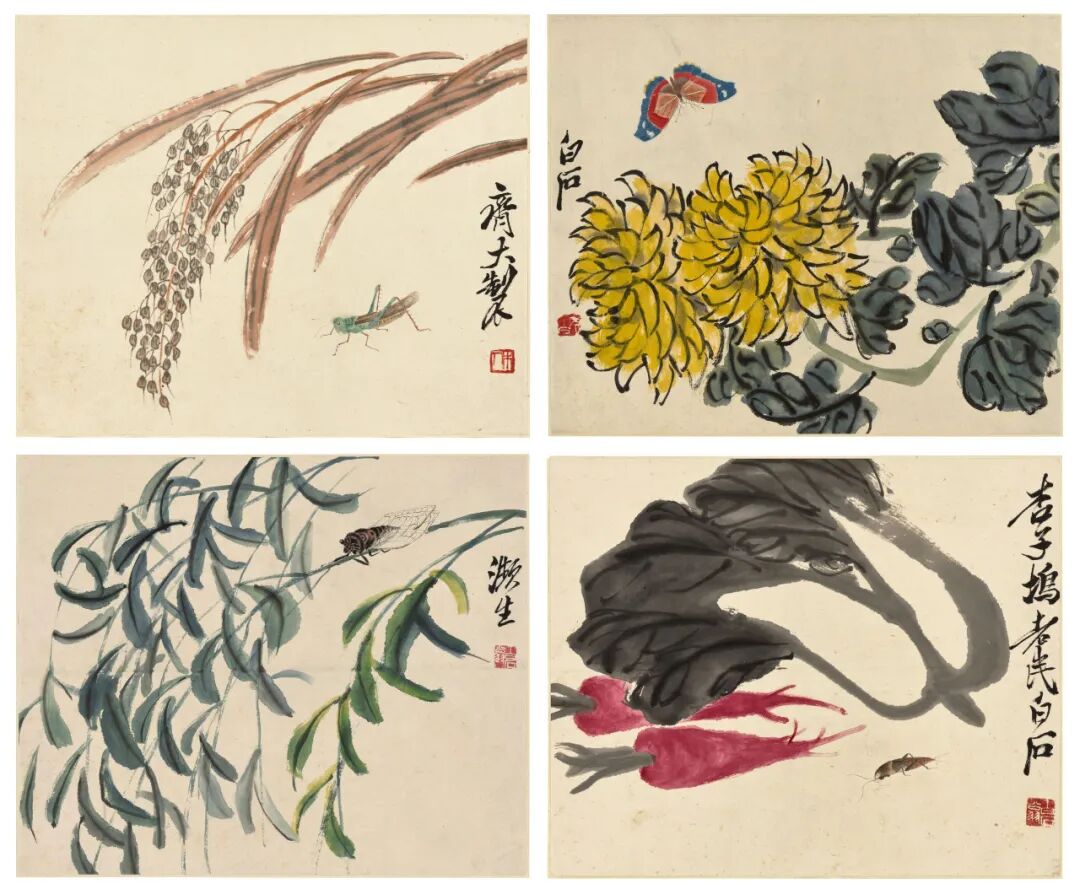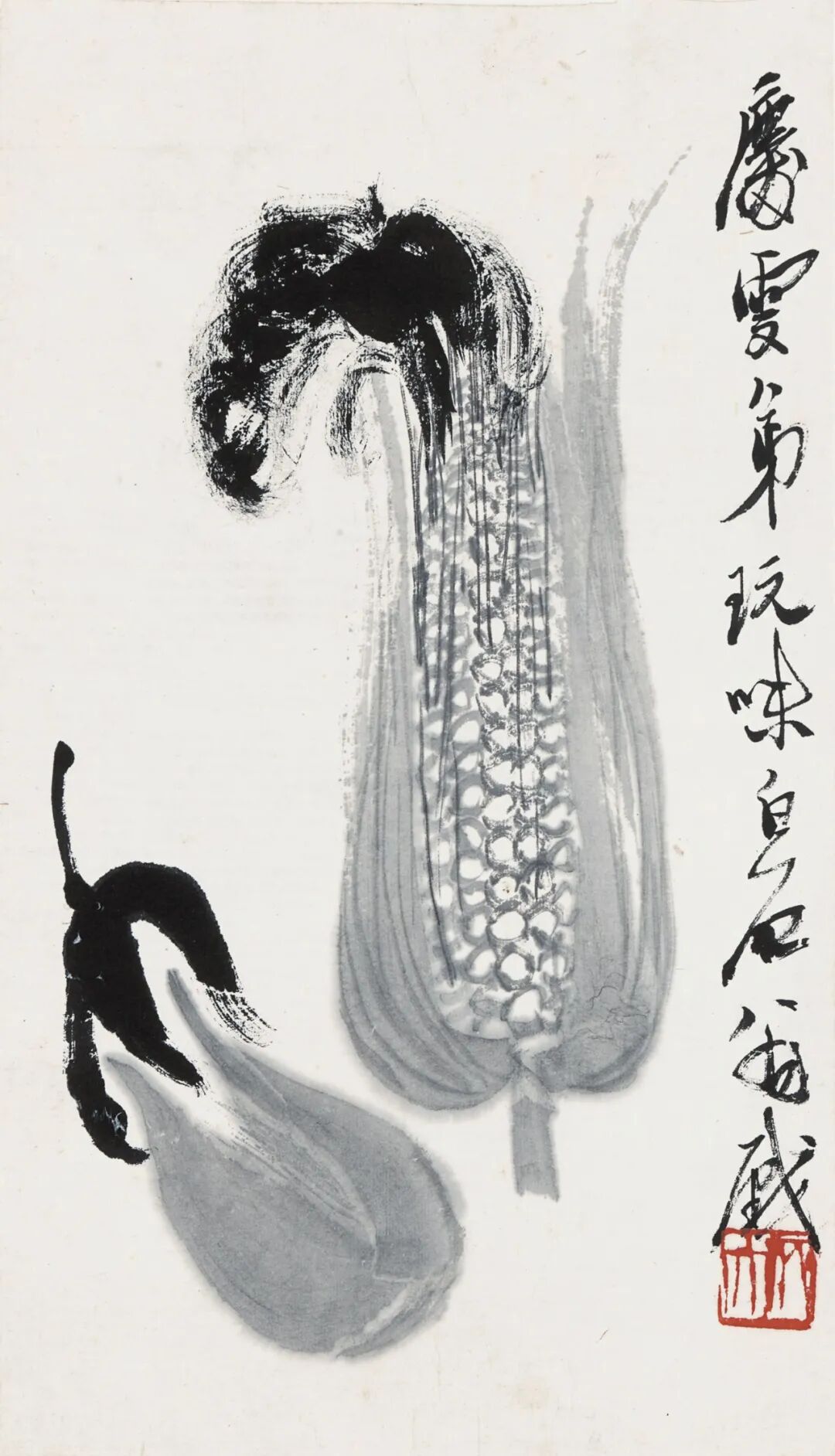 比如这幅《蔬果图》,玉米和茄子,这是传统文人画不屑画也不会画的,而齐白石用醇厚的笔墨功夫和热爱生活的烟火气,为中国画的表达探索了更多可能。