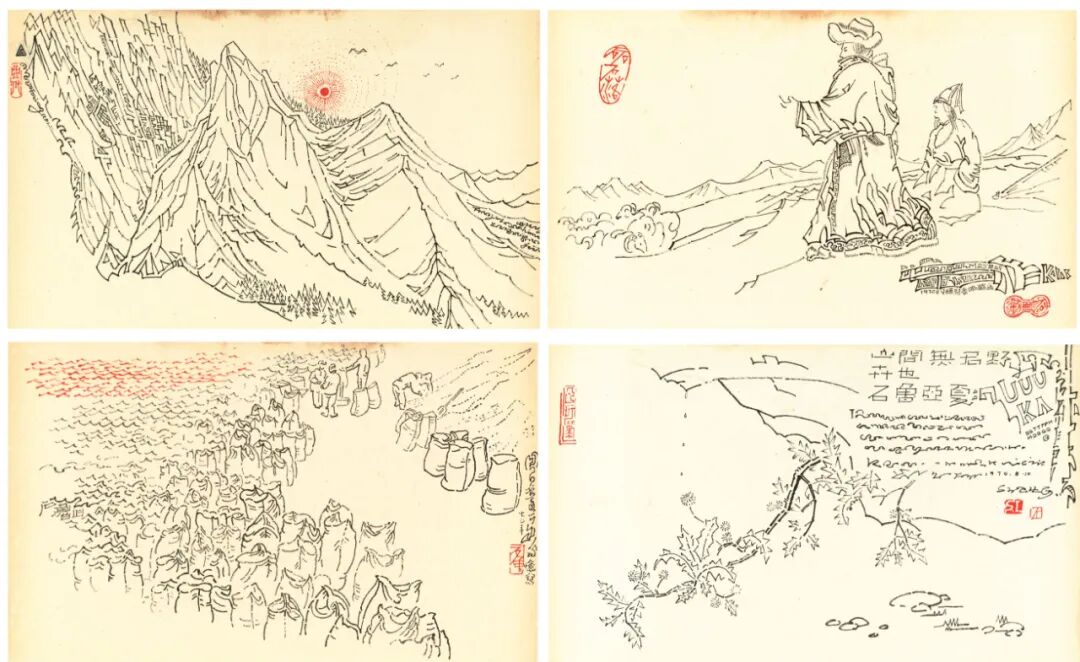但是疯了之后,石鲁依旧疯狂地创作。1970年前后,他翻出50年代的写生作品,在牛棚里偷偷地直接在原作画面上反复加工改画,将那些臆想中的文字、字母或者图案添加到自己过去的画作里。