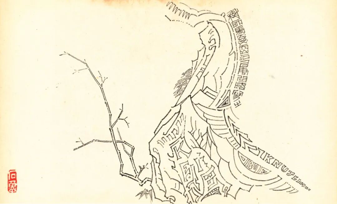 忽而篆隶,忽而英文字母,再看又是山石树木,图案与文字互相嵌套,层次里头还有层次。