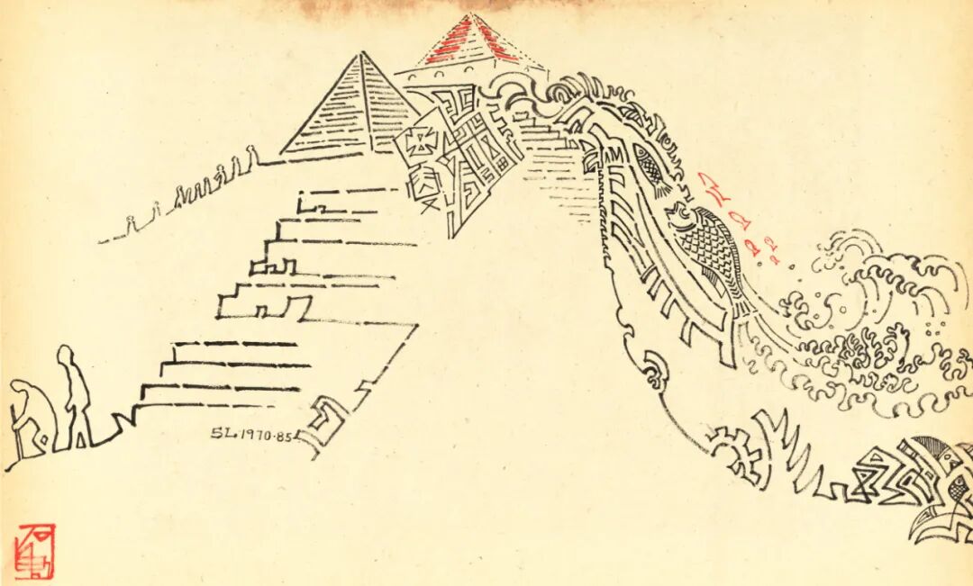 埃及金字塔配上中国的鲤鱼跳龙门纹饰,似乎昭示世事变幻无常。