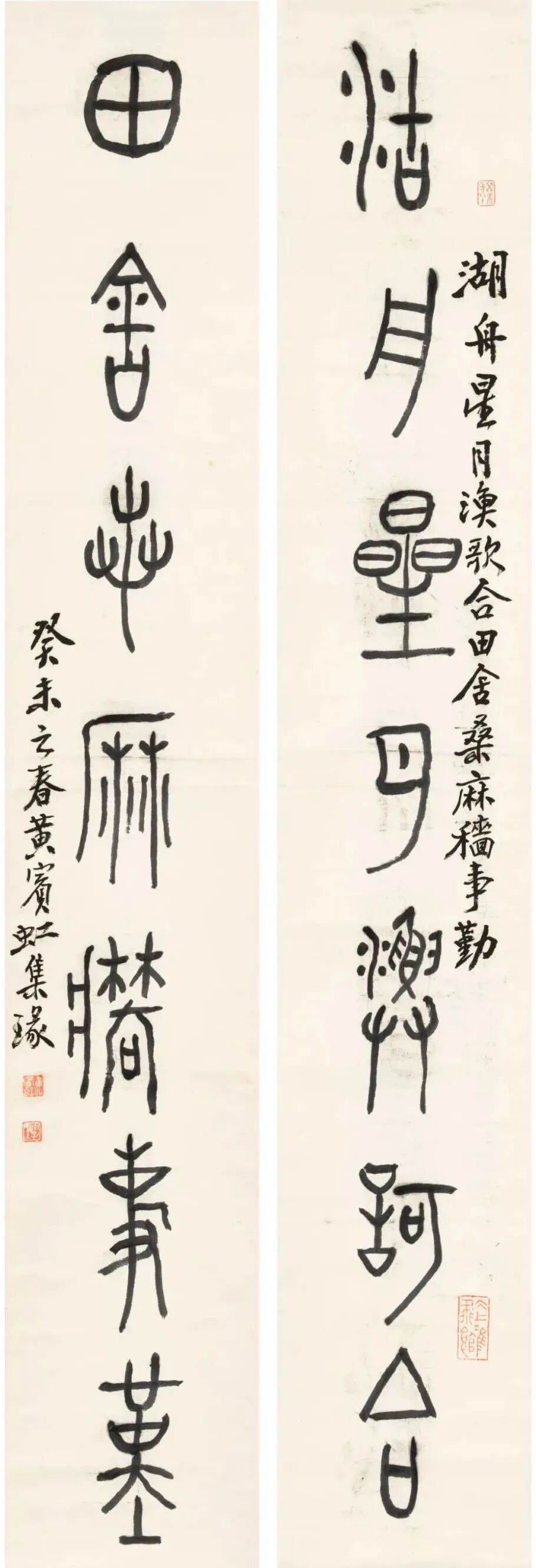 这幅篆书七言对联,正是老人晚年的风格。用半干的焦墨写来,运笔较慢,笔画时粗时细,有一种散淡而又古拙的味道,饱含金石气。