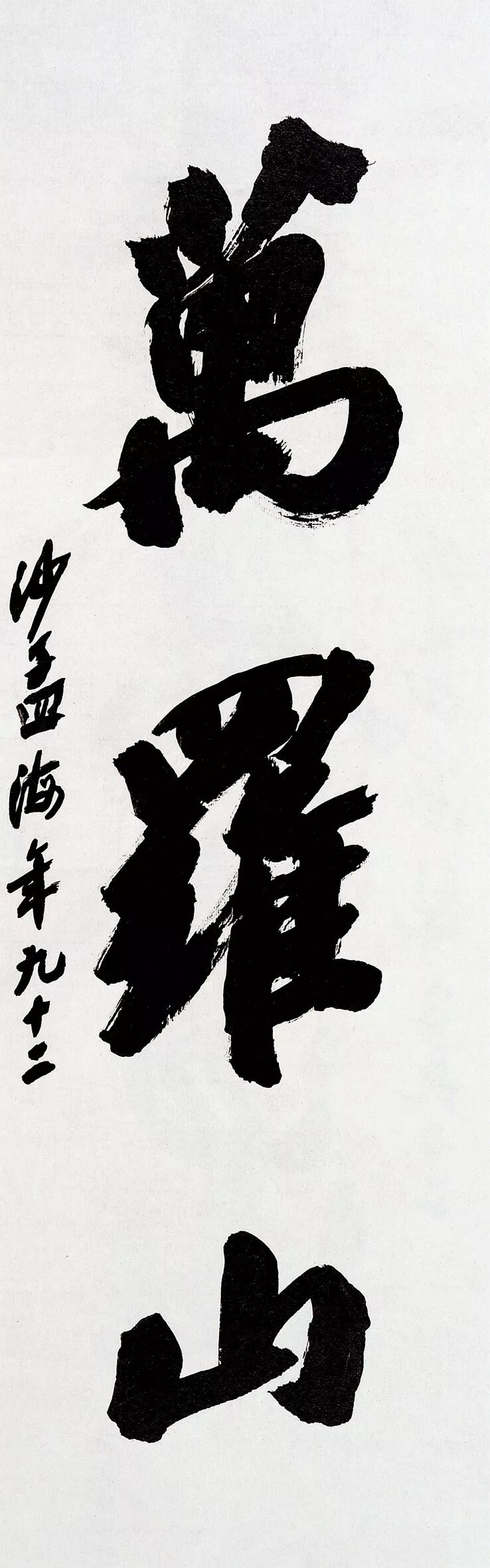 1928年,沙孟海发表《近三百年的书学》《印学概论》两部著作,被学术界认为是书法、治印领域的扛鼎之作,因而名声大噪,被视为海上名人。1929年,年仅29岁的沙孟海,被聘任为广州中山大学预科国文教授。1931年历任南京中央大学、教育部、交通部秘书。1941年,经同门同乡陈布雷推荐,任蒋介石侍从室秘书,专事编撰蒋氏家谱及应酬笔墨文字,闲时坚持书学研究,“只写一些庆吊应酬文章,写写家谱,绝不涉足政治和机密。”沙孟海最为后世所知与认可的,当数他的榜书。榜书,古称署书,即题在宫阙门额上的大字。后来把招牌、匾额、摩崖、碑石上的大型字,统称为“榜书”。沙孟海“榜书第一”,其大字用笔横扫,出入自如,结体险劲逼仄,构成上点、线、块、面对比强烈,空间感、现代感极强。从欣赏角度来看,沙孟海书法特别重“势”重“力”,这主要表现在他的榜书和摩崖大字上。沙孟海擘窠大字在书法界独占鳌头,其风格由秀逸儒雅到浑厚华滋最终归于古拙朴茂,一如草木之由春之绚丽多姿到夏之煊赫灿烂而人于深秋的豪迈深远最终归于冬之空旷无际。结字的斜画紧结,不主故常;用笔的侧锋取势,迅捷爽利,锋棱跃然;线条的浑厚朴拙,于纵横之间任其自然,令人羡叹不已。董其昌云:“渐老渐熟,渐熟渐离,渐近于平、淡自然,而浮华利落矣。姿态横生矣,堂堂大人相独露矣。”此语可为沙孟海独特书法艺术风格写照。晚年沙孟海“人书俱老”,尤精行草书,虽然保持原有的斜解构书的风貌,但对比更为强烈,用墨更趋浓重,苍老、生辣、遒劲,气酣势疾,刚健有力,韵味沉厚,卓然成家,“真力弥满,吐气如虹。海内榜书,沙翁第一”。行书天鹅湖图诗堂 纵三二厘米横八〇厘米一九九一年个人藏行书临池一助题字 纵二二〇厘米横一五〇厘米 个人藏行书屈铁画沙题字 纵三七厘米横二八厘米一九八七年个人藏行书海滨邹鲁题字 纵三三厘米横一二六厘米一九九一年沙孟海书学院藏
