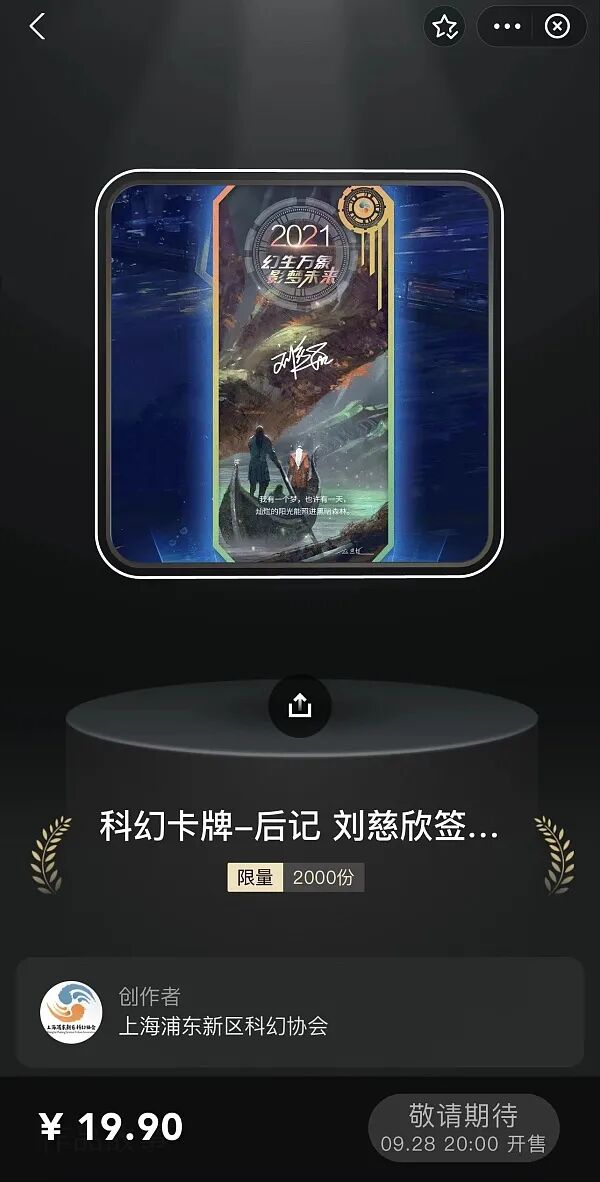 因此,粉丝粒的数字艺术品产品还是非常多元的。近期发售的数字科幻卡牌更特殊,官方介绍,某些特殊编号的数字艺术品卡牌还可以兑换一些非销售类商品,包括科幻作家签名明星片、纪念T恤、第四届科幻影视产业论坛的入场券等。